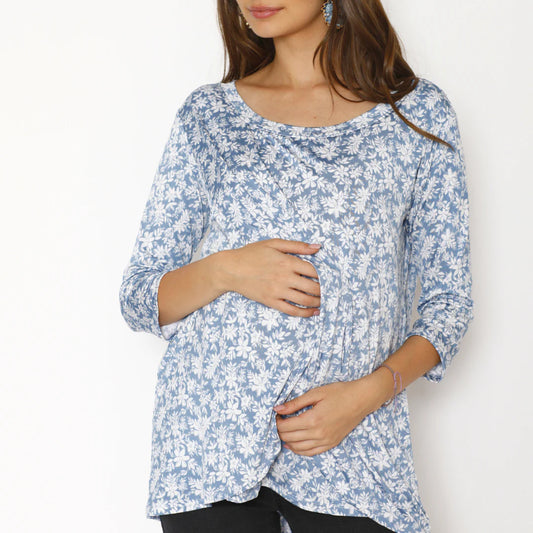 Camisa de Dormir Maternal y de Lactancia de Algodón Pima - Ramitas Azul