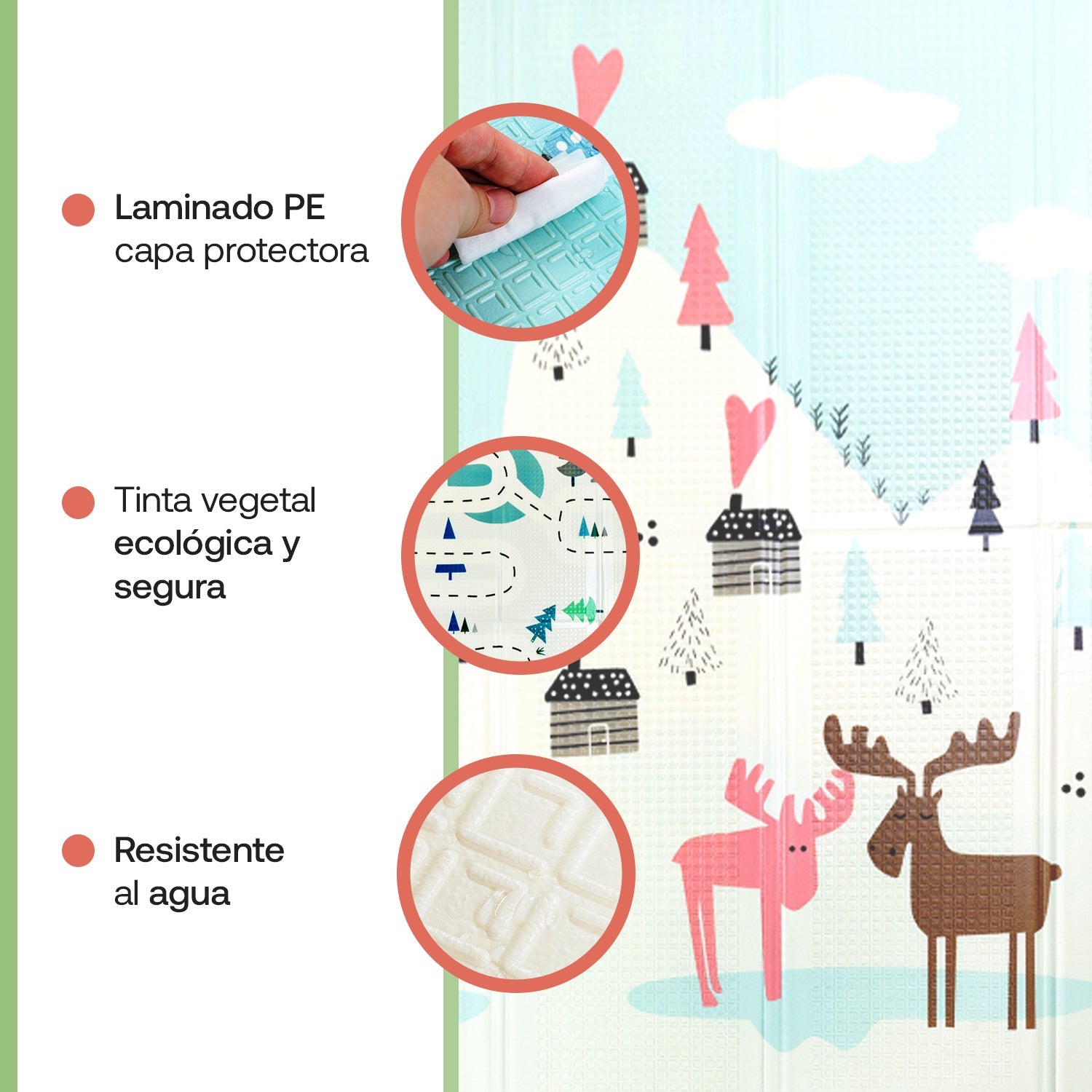 ¡Descubre la alfombra de juego con alta elasticidad y protección! Esta alfombra de 180 x 200 cm se adapta perfectamente a las necesidades de tu hijo, ofreciendo un espacio seguro y cómodo para jugar. Fabricada con una capa exterior de laminado PE, es resistente al agua y duradera. Los diseños impresos utilizan tinta vegetal, ecológica y segura para los niños. Su núcleo de revestimiento XPE de alta elasticidad garantiza una excelente amortiguación y protección ante impactos. Además, cuenta con diversas certificaciones internacionales que aseguran su calidad y seguridad.