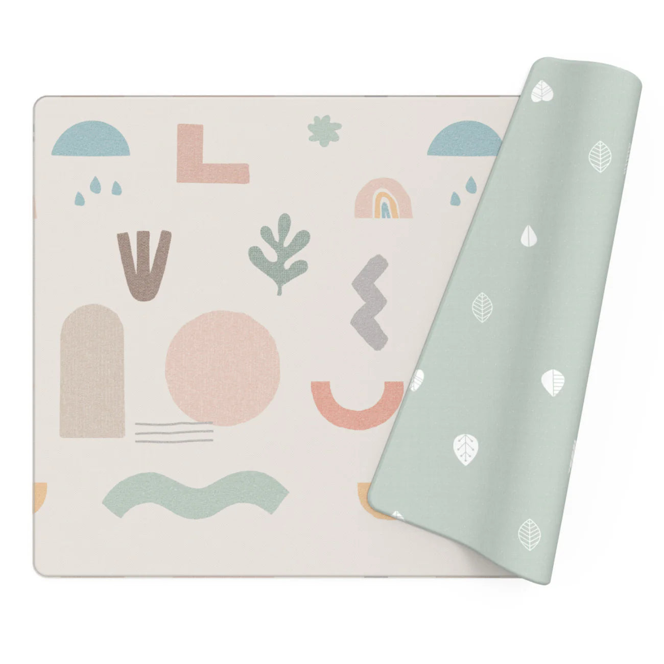 A favorite! A beige background with fun and decorative pastel-colored figures that invite you to play with the family. It simulates a very colorful desert. On the other side, a soft mint-colored background with a unique touch of small white leaves.
