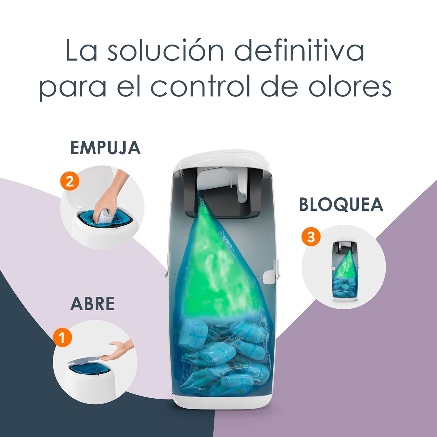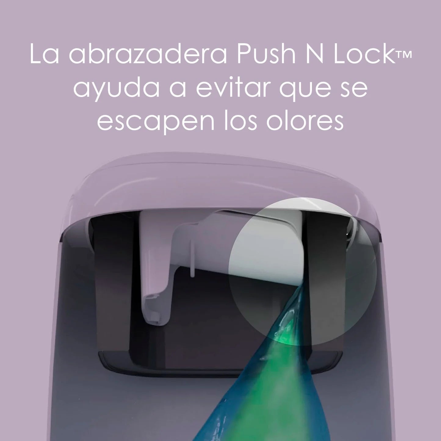 Gracias a su abrazadera Push N Lock y su película multicapa con tecnología Max Odor Lock, este sistema bloquea eficazmente los olores desagradables, incluso con varios pañales usados en su interior.