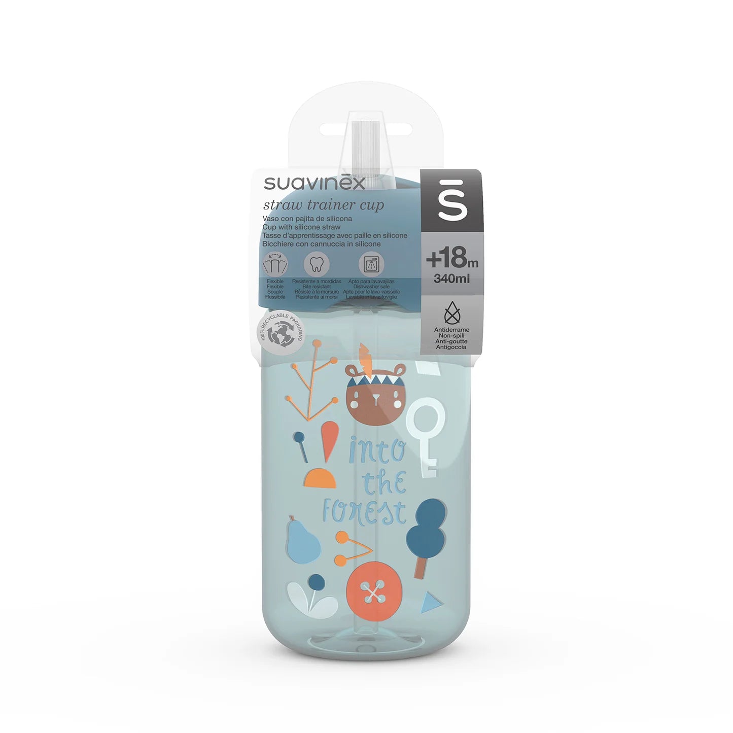 The Suavinex bottle with silicone straw features a charming design decorated with forest motifs, part of the "In to the Forest" collection. It is ideal for children over 18 months, promoting their independence and perfecting sucking through the silicone straw.