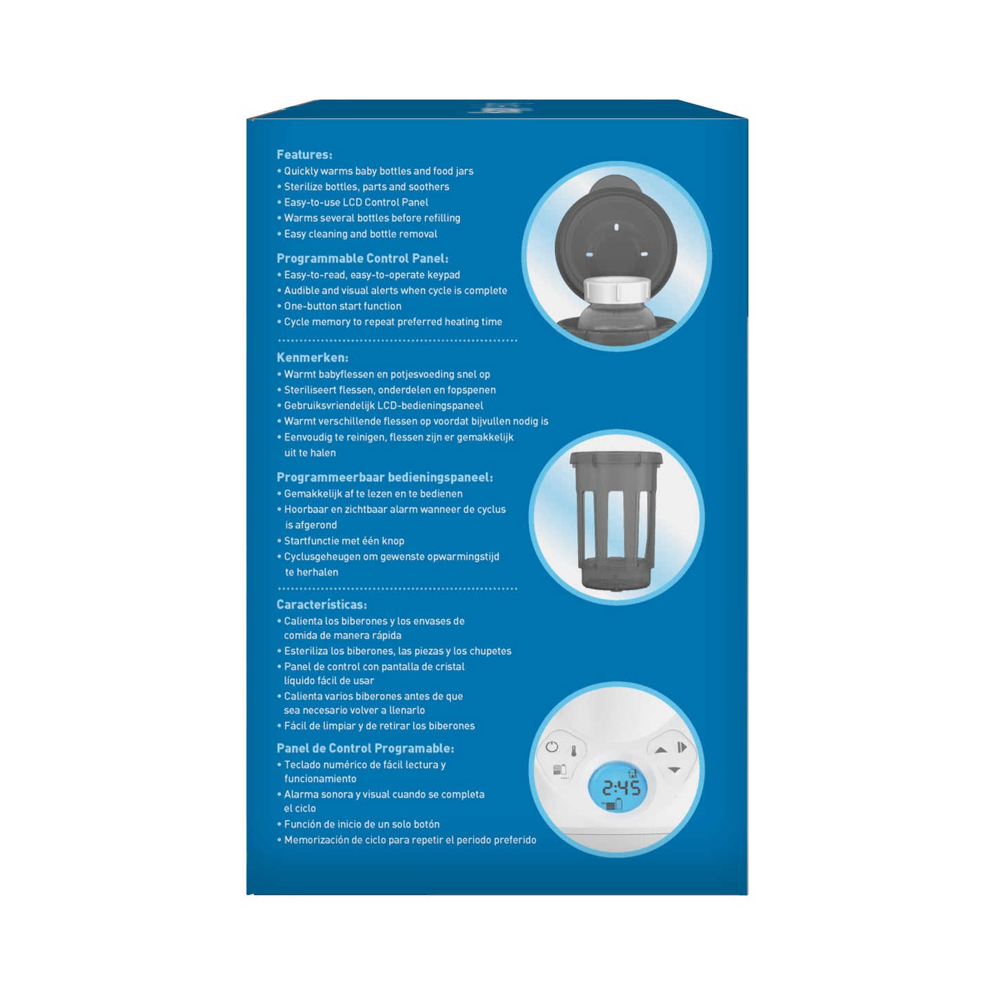 - Calentamiento Eficiente: Por ejemplo, calienta una mamadera de 120 ml a temperatura ambiente en solo 2:30 minutos, o desde el refrigerador en 3:55 minutos.
