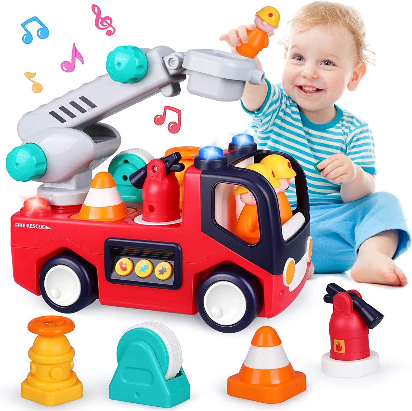 It comes with equipment: a fire extinguisher, a warning cone, a tap and a fire hose. Each toy is removable. This toy provides lots of fun that will keep your child interested and entertained.