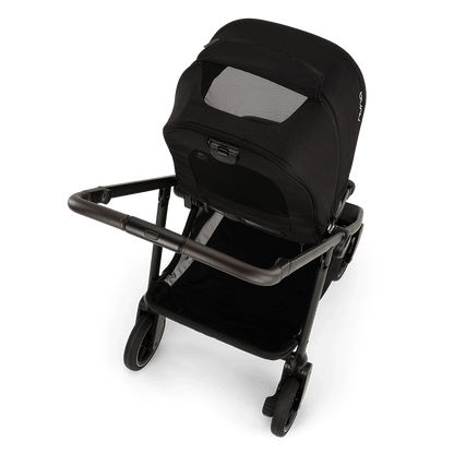 Capota extensible UPF 50+ repelente al agua, con visera plegable y ventana para mayor ventilación.