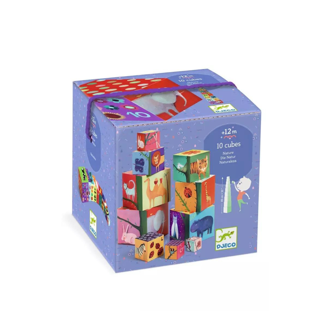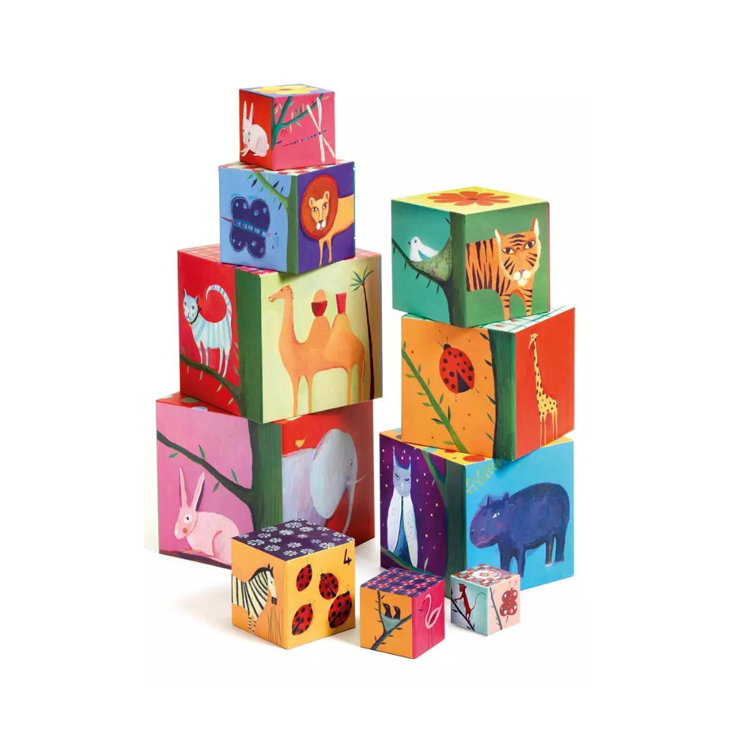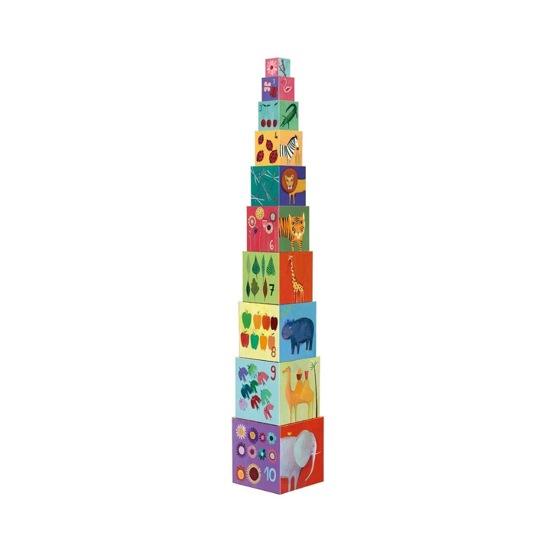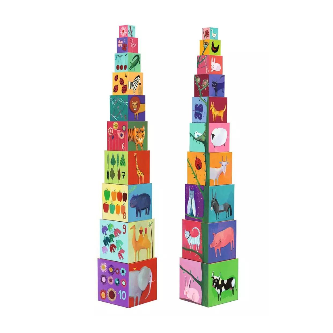 Explore a world of fun and education with this exciting stacking cube set. This set includes 10 colorful cubes, each decorated with fun illustrations of animals, numbers and more, perfect for building an impressive tower while learning through play.