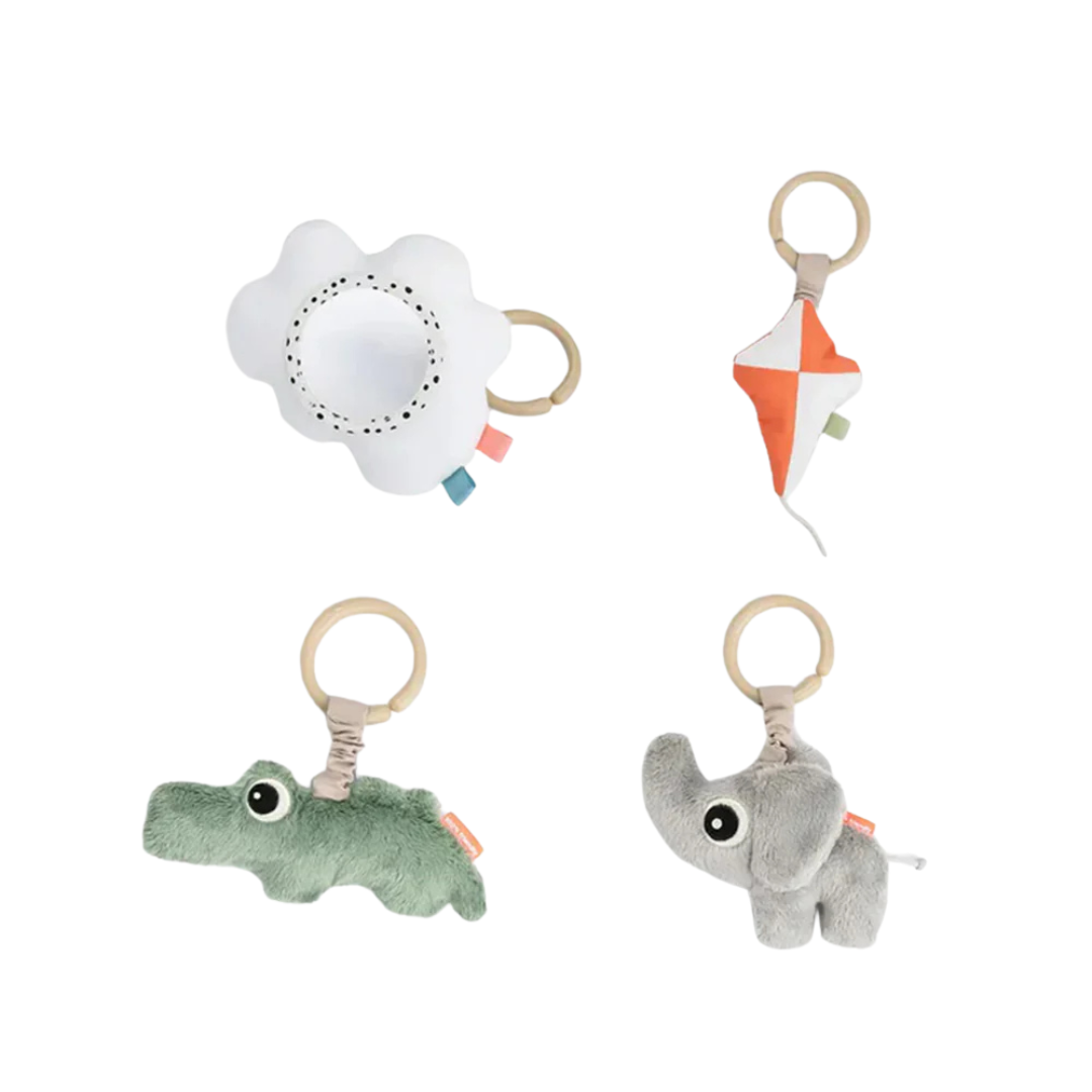 Incluye 4 juguetes colgantes: sonajero, campana, juguete arrugable y espejo, todos pensados para desarrollar el oído, el tacto y la curiosidad. Los juguetes se pueden ajustar a la etapa de desarrollo o usarse de manera independiente, fomentando el aprendizaje y el juego libre.