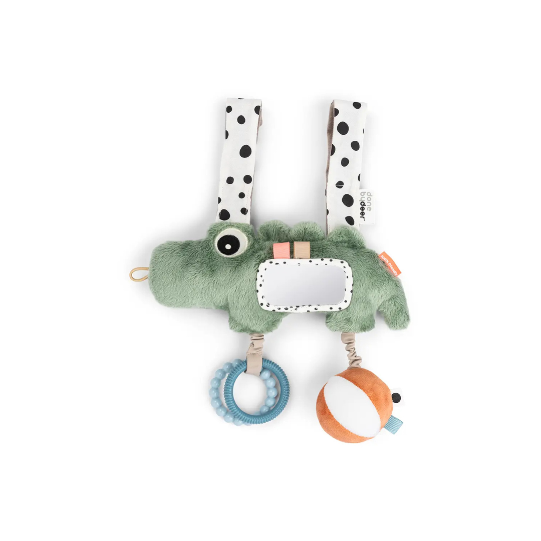 Este encantador juguete de actividades colgante con forma de cocodrilo está diseñado para estimular los sentidos de tu bebé mientras se divierte durante los paseos o viajes en auto. Con texturas variadas, un cascabel escondido y un espejo, invita a explorar, escuchar y descubrir.