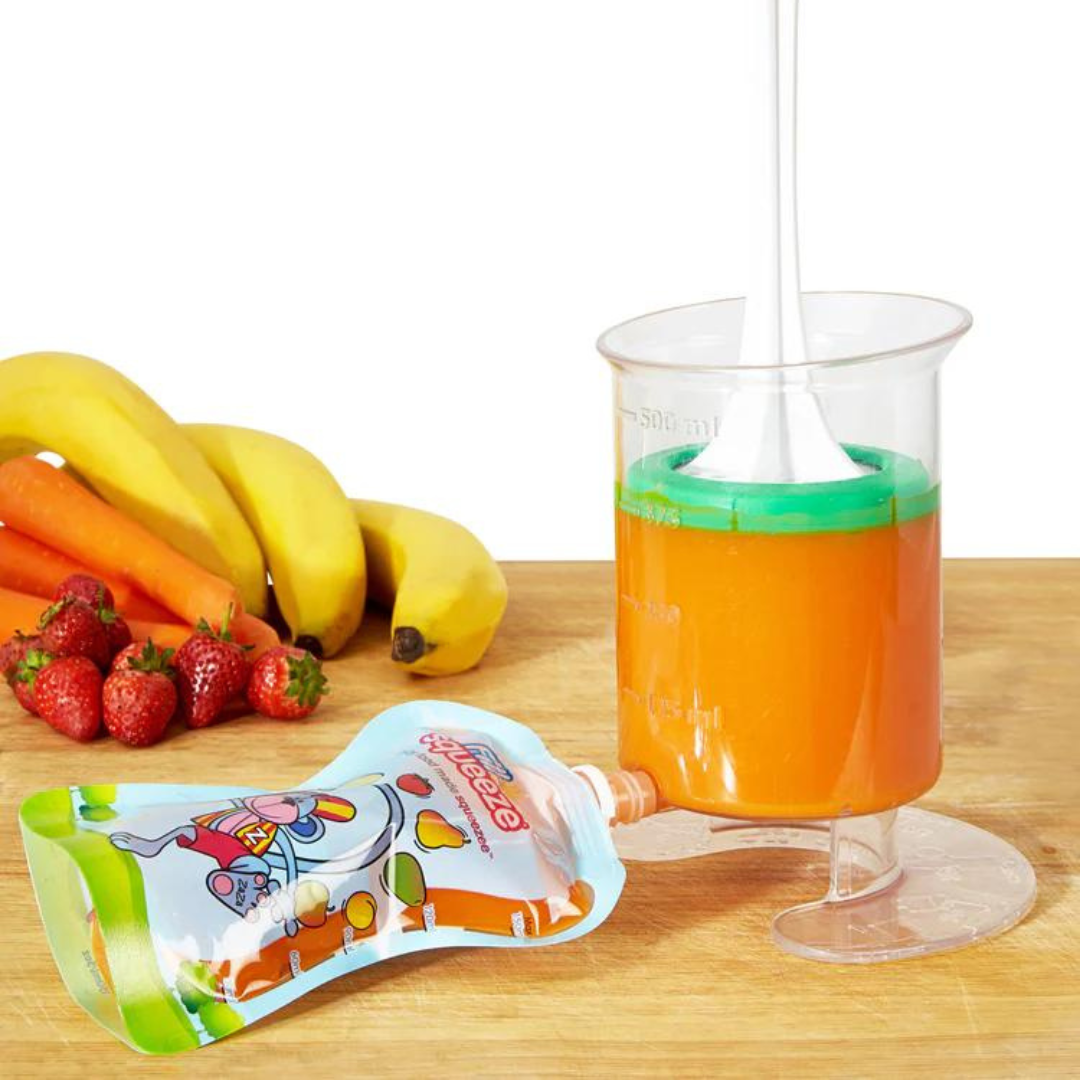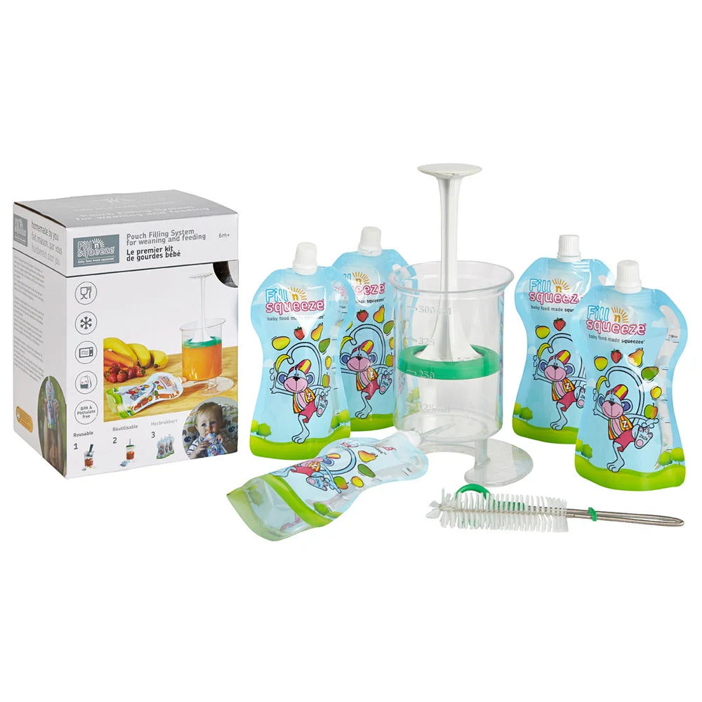 The Fill n Squeeze Starter Kit is the perfect solution for preparing, storing and serving healthy homemade meals for your children. This complete kit includes a Filling Station, a Plunger, a Silicone Accessory, a Lid and 5 reusable 150 ml bags, sterilized and ready to use. In addition, it includes a practical brush to make cleaning the bags easier, allowing you to reach all corners and prolong their useful life.
