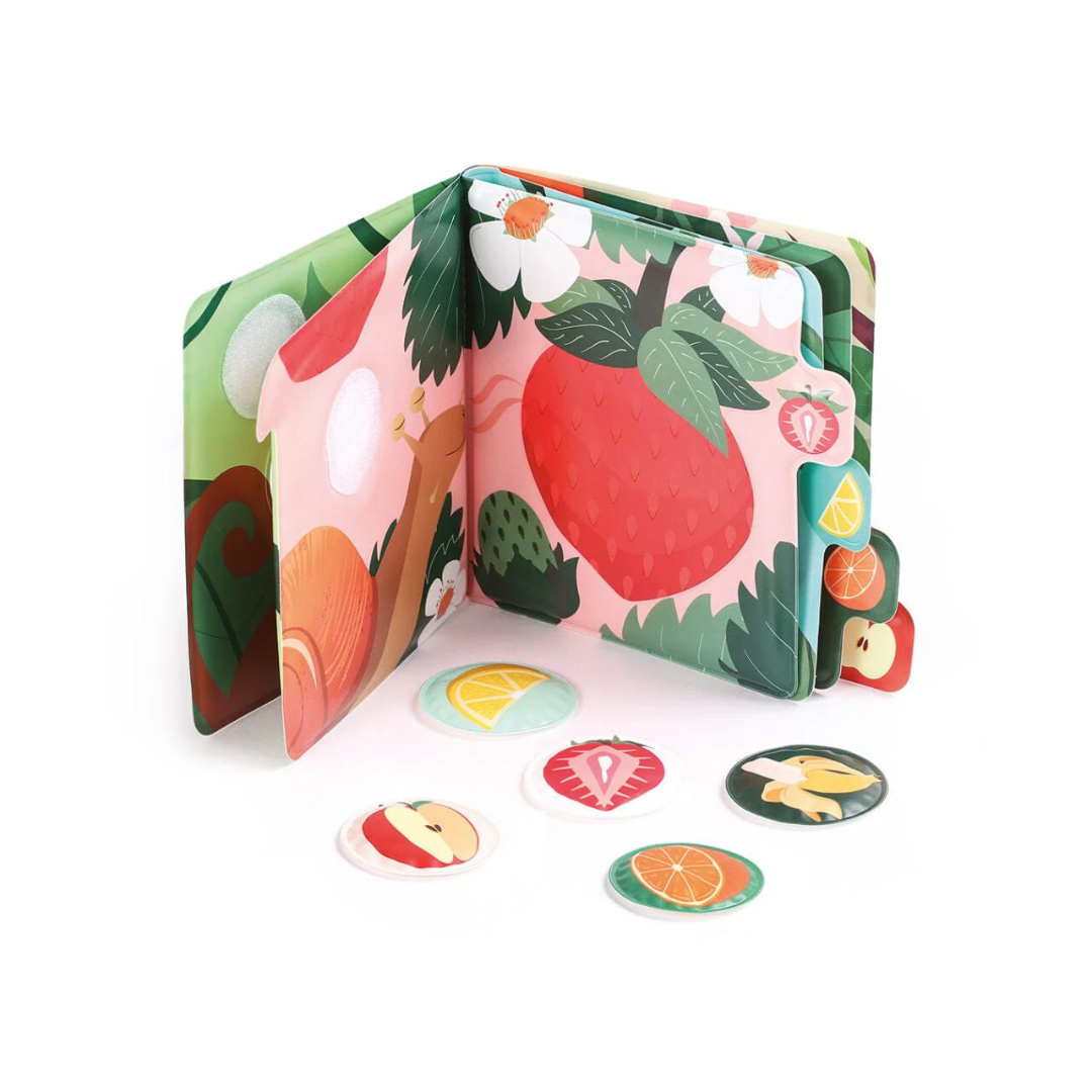 - Aromas naturales y divertidos: Frotando las pegatinas olfativas, podrán oler frutas como fresa, manzana, naranja, melocotón y uva, haciendo del aprendizaje un juego activo.