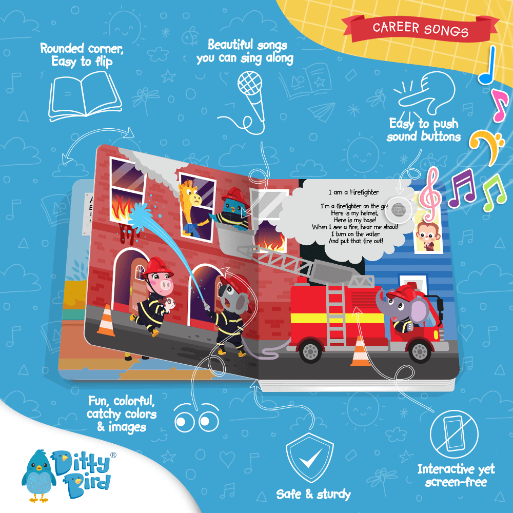 Inspire your little one's career aspirations with Ditty Bird's Career Songs sound book. Filled with charming tunes like "To the Hospital" and "I am your teacher," this interactive book introduces preschoolers to a variety of careers, sowing the seeds for future ambitions in a fun and engaging way.
