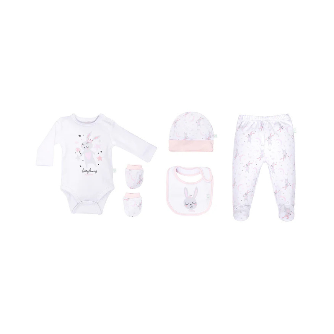 Dale la bienvenida al mundo con suavidad y estilo gracias a este set de 5 piezas, especialmente diseñado para los primeros días del bebé. Confeccionado en 100 % algodón, cada prenda es suave, transpirable y delicada con la piel del recién nacido, asegurando confort y protección desde el primer momento.