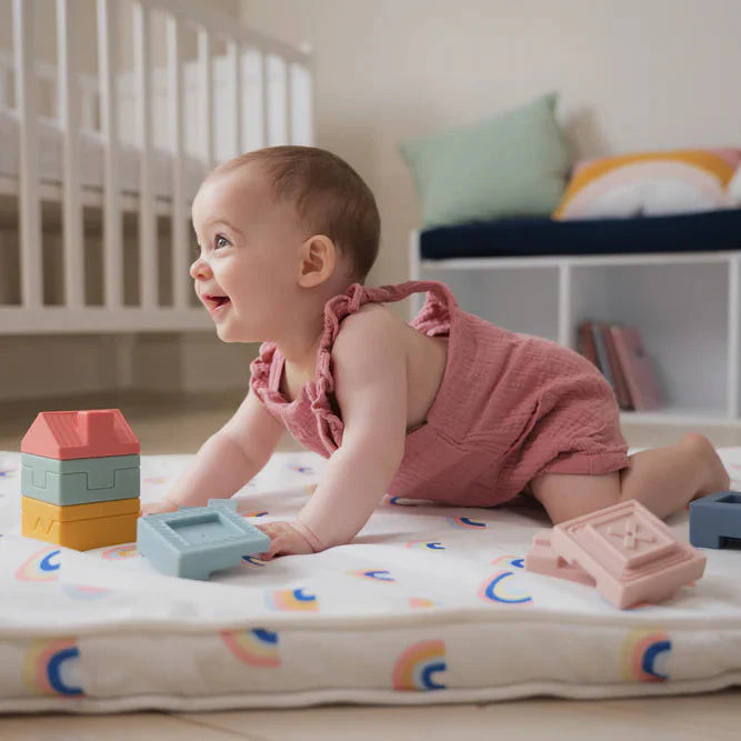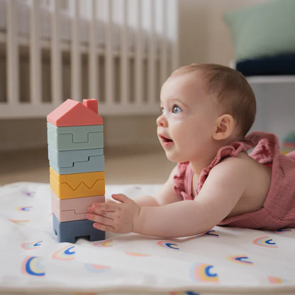 Con Mis Primeros Bloques de Construcción, tu bebé podrá explorar, apilar y crear mientras desarrolla habilidades fundamentales a través del juego libre. Este encantador set de bloques en tonos pastel está especialmente diseñado para adaptarse a manos pequeñas, ofreciendo una experiencia sensorial y motriz suave, segura y estimulante.