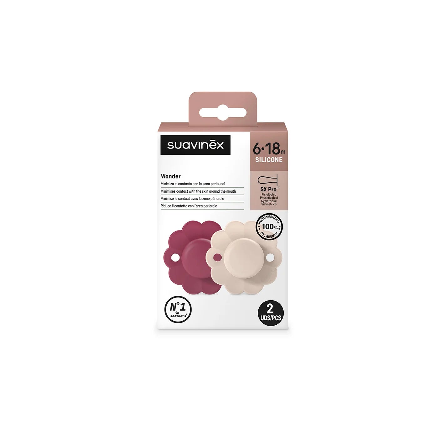 Este pack incluye dos chupetes Wonder, diseñados para cuidar el desarrollo bucodental de tu bebé con elegancia y comodidad.