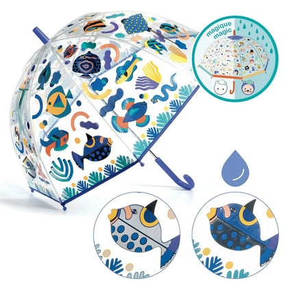 Haz que los días lluviosos se llenen de alegría y asombro con este paraguas mágico de peces. Su diseño encantador no solo protege del agua, sino que también cambia de color al contacto con la lluvia: las áreas blancas se transforman mágicamente y, al secarse, vuelven a su color original... ¡para que la magia comience de nuevo cada vez que llueva!