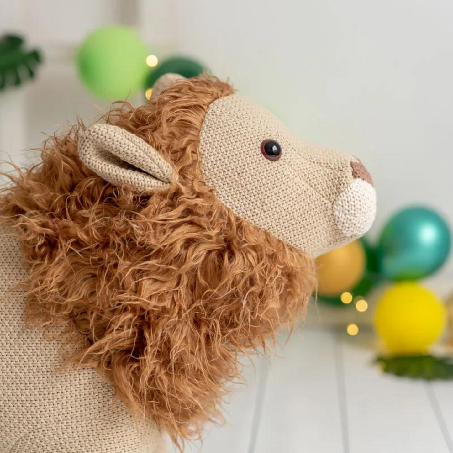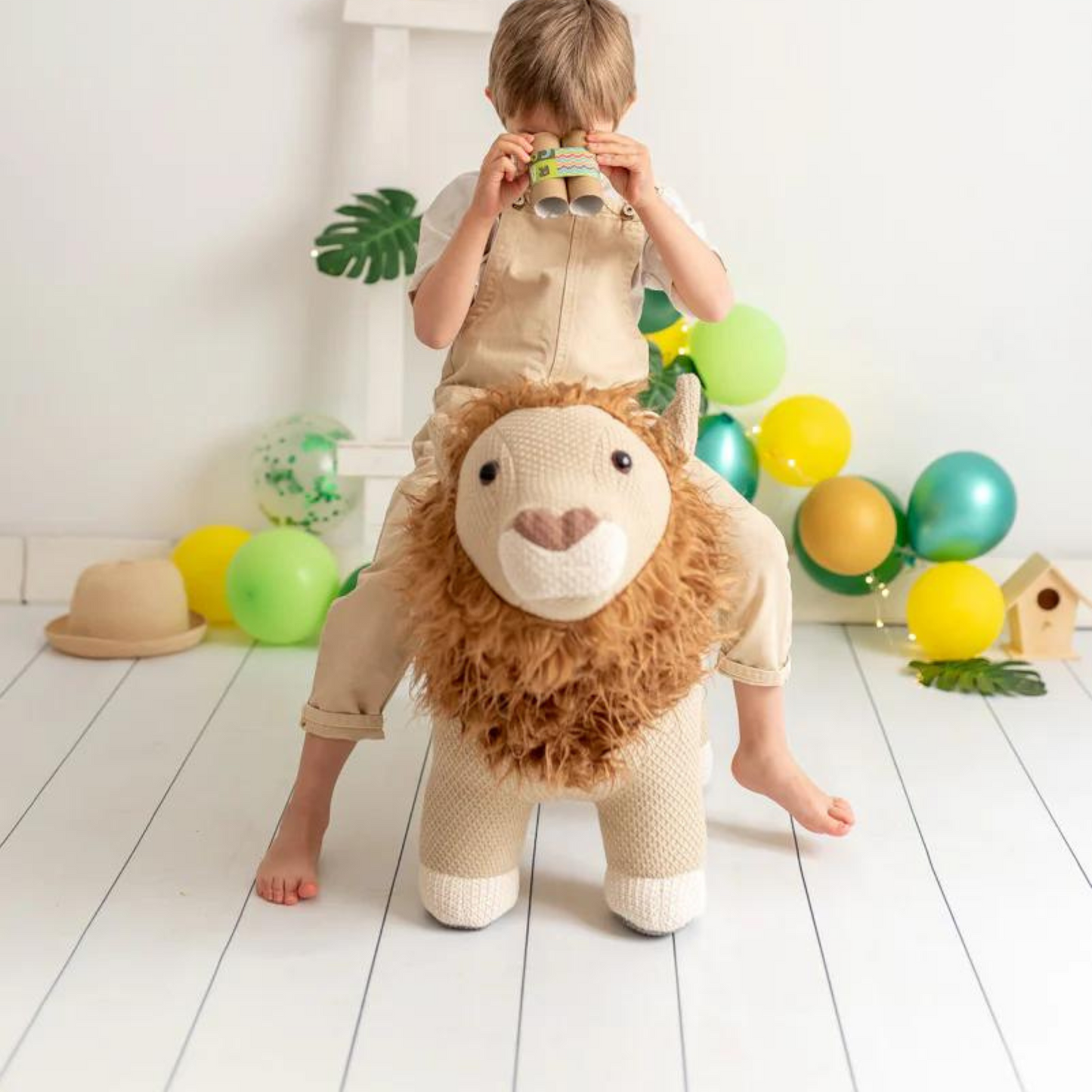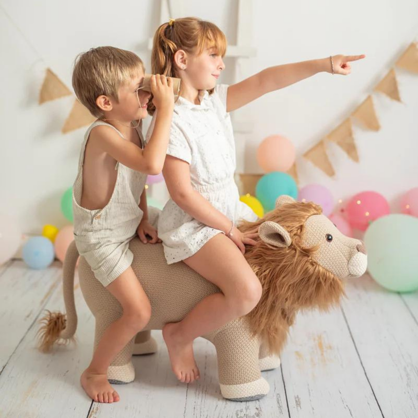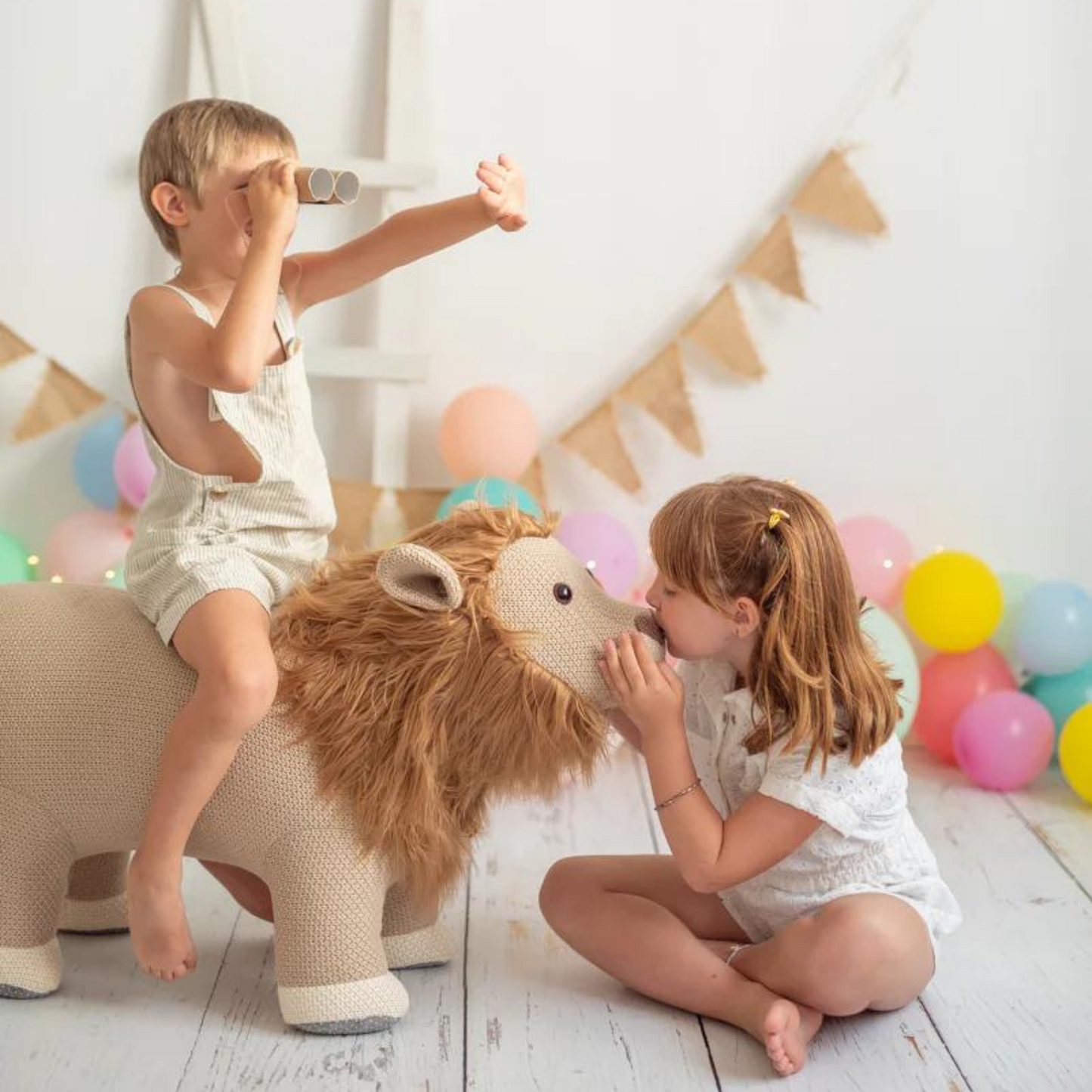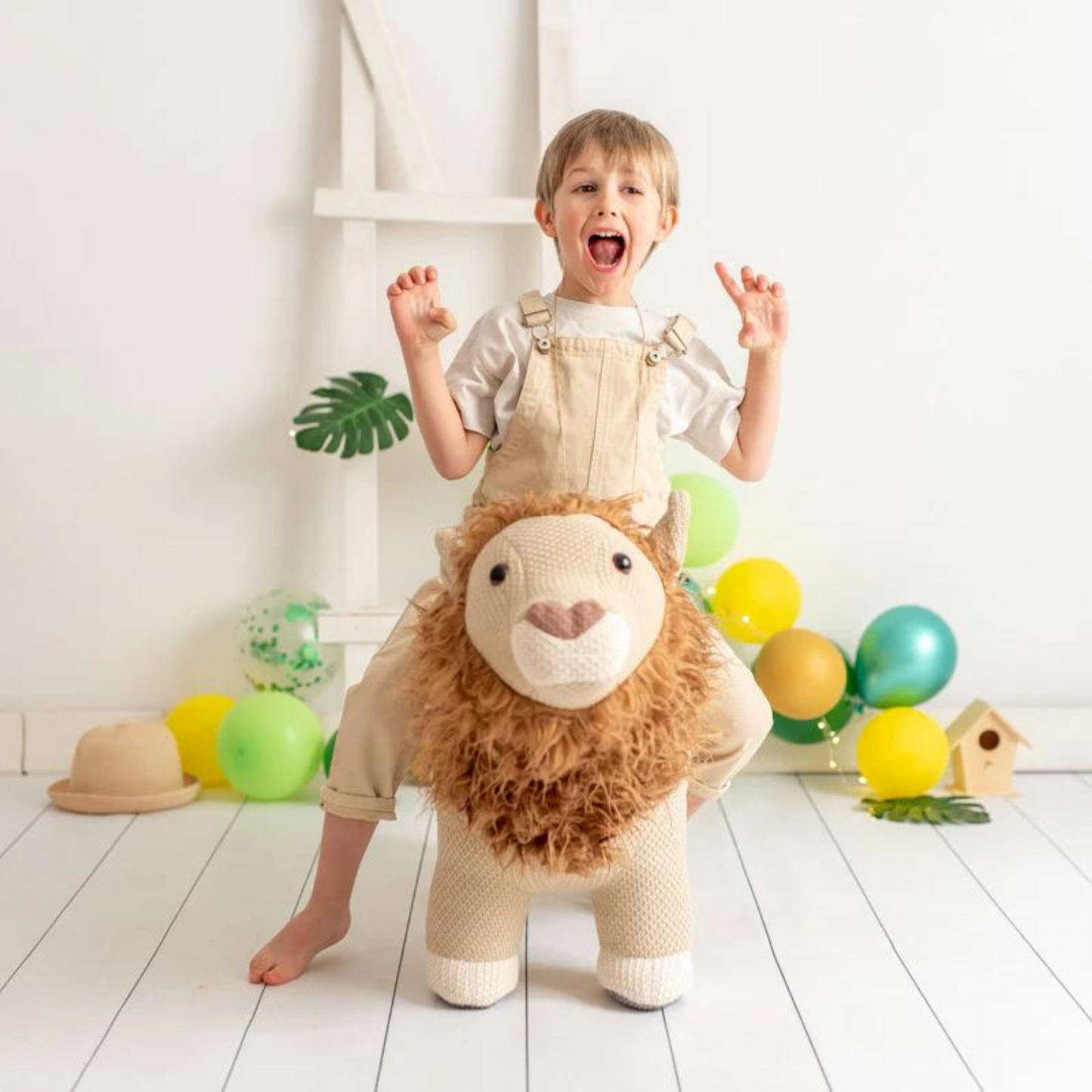 El León Maxi de la marca Crochetts está hecho a mano con algodón 100% natural, hipoalergénico y muy suave al tacto, en tonos marrón oscuro y marrón claro. Su acabado detallado, incluyendo el característico pelo en la cabeza, lo convierte en un compañero especial para los niños y un elegante elemento decorativo. Dispone de una estructura interior de madera de pino, capaz de soportar hasta 70 kg, y suelas antideslizantes para mayor seguridad.