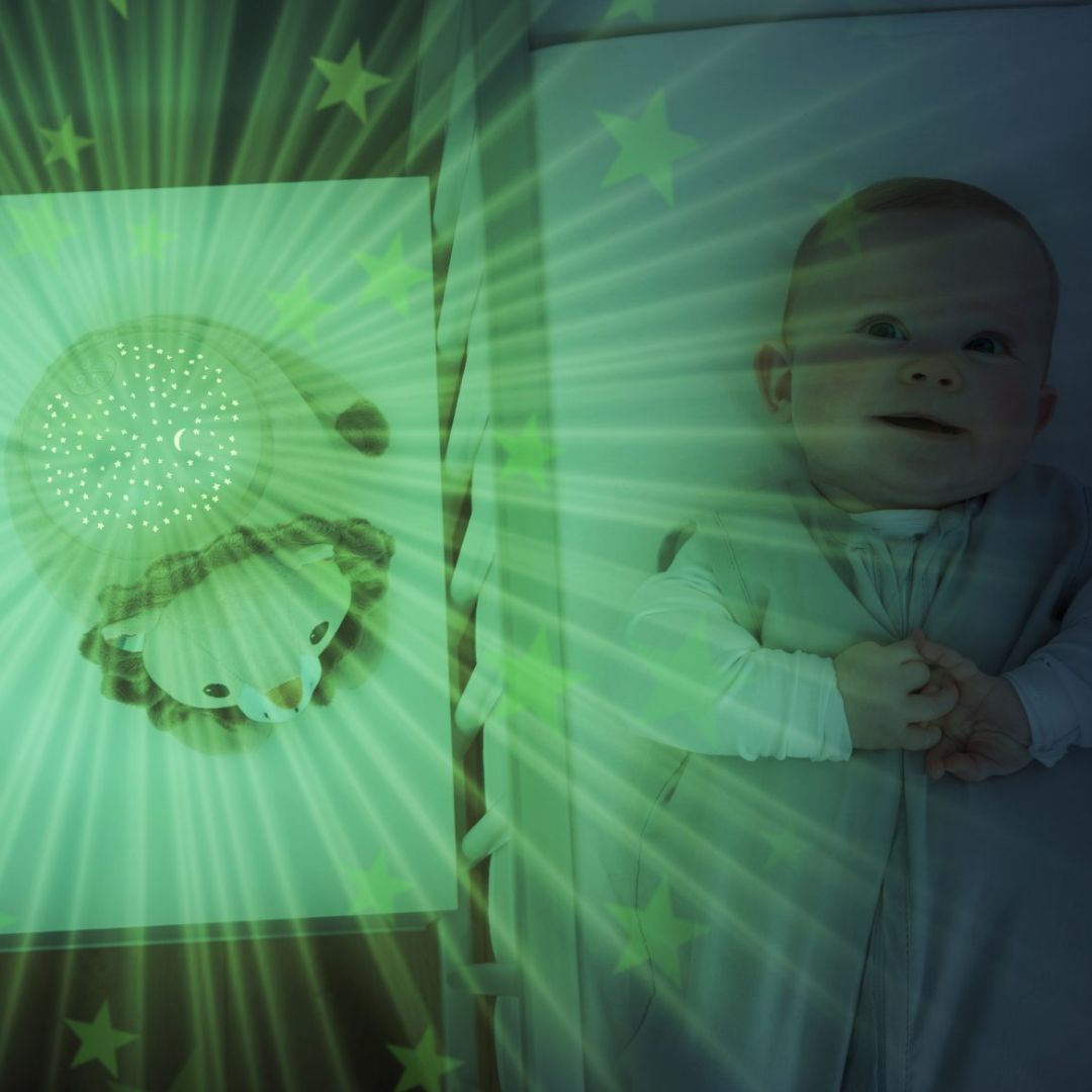Projects stars and moon onto the ceiling in different colors, while emitting relaxing sounds: heartbeat, nature sounds or lounge music.