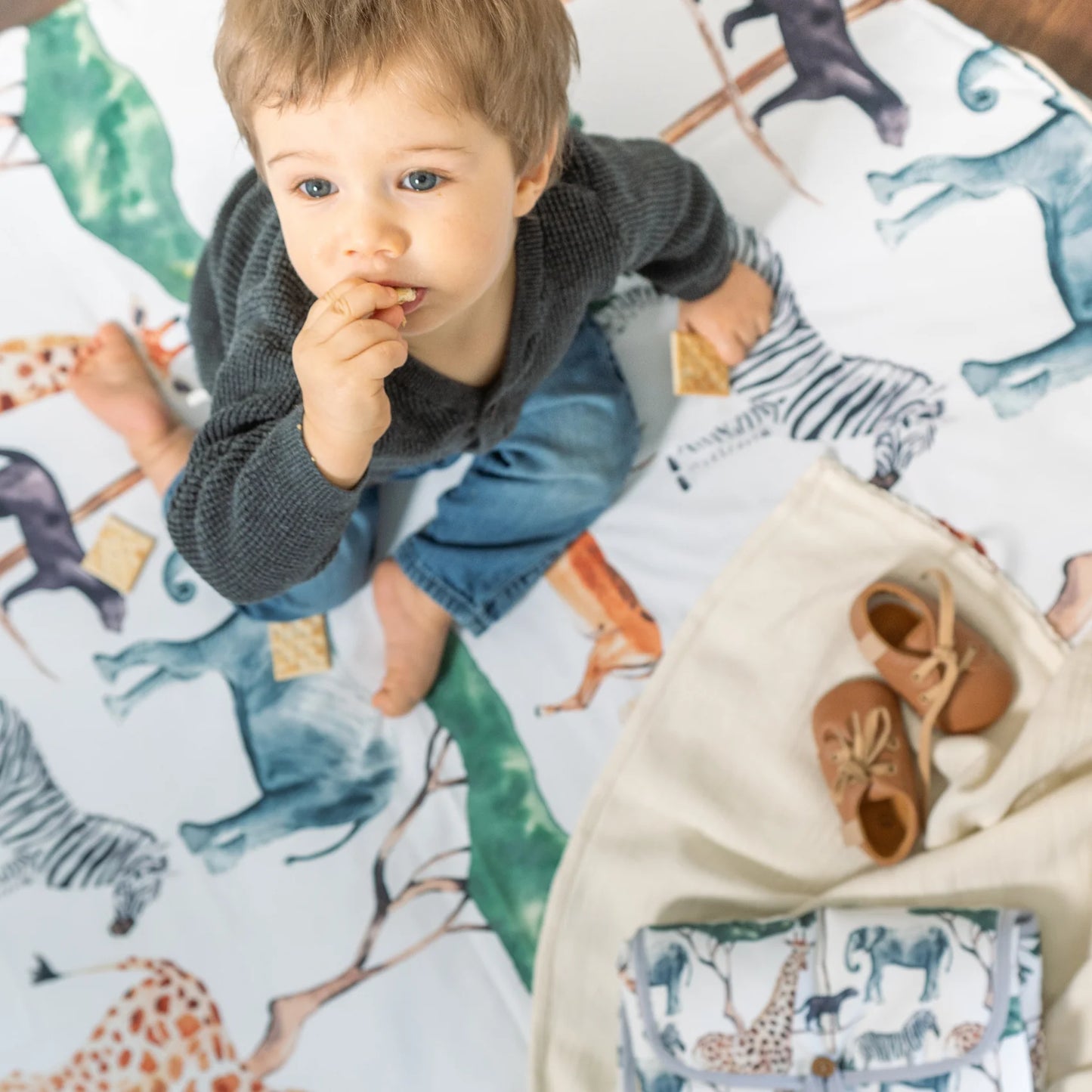 These playmats are padded, soft and easy to carry. They turn into a bag to carry toys everywhere. They are waterproof and ideal for taking to the park as the moisture from the grass does not penetrate through.