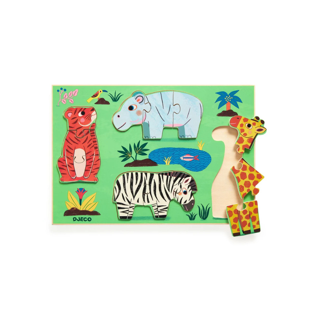 Con el adorable Puzzle "Coucou Tigre", tu pequeño se embarcará en una aventura salvaje mientras desarrolla habilidades esenciales. Este rompecabezas de madera con piezas grandes y coloridas invita a explorar formas, colores y coordinación de una manera lúdica y segura.