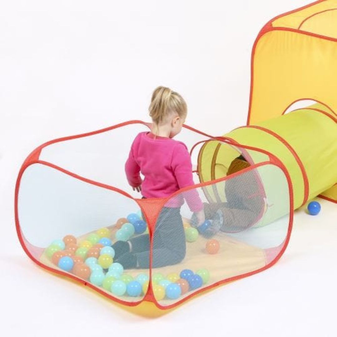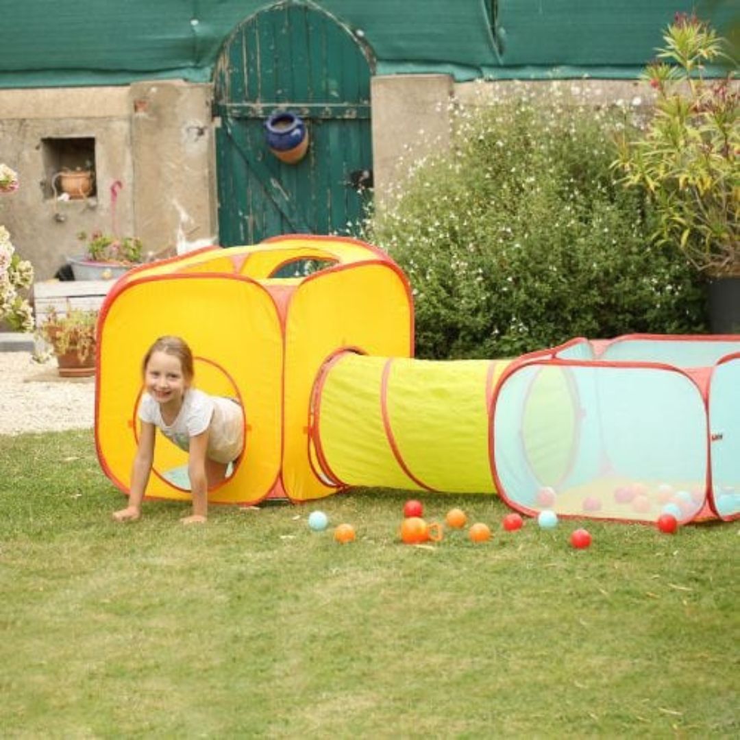 The Ludi Pop-Up Play Field is a versatile space consisting of a cube, a tunnel and a ball play area, offering 3 spaces to use alone or combined, forming a unique field to play however you like!