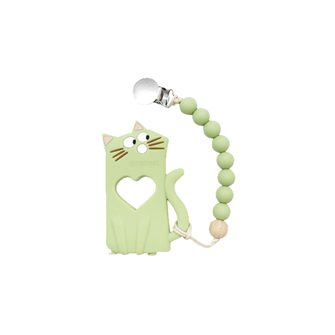 - Mordedor en forma de gato con cadena para chupete, hecho de silicona segura.