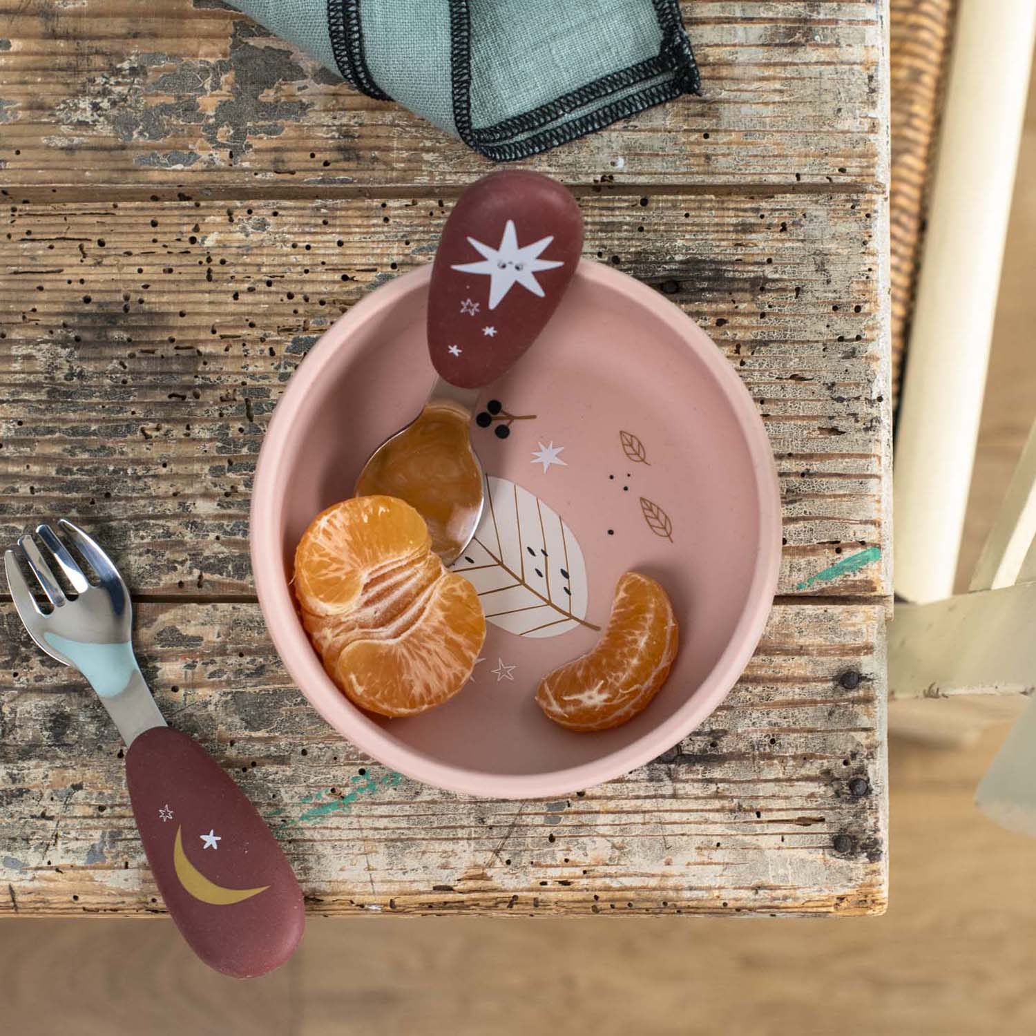 Cada cubierto combina mangos de silicona antideslizante, fáciles de sujetar para manos pequeñas, con puntas de acero inoxidable que aportan durabilidad y firmeza. Su diseño inspirado en la colección Puce & Pilou hace que la hora de comer sea más entretenida, mientras que su practicidad se refleja en que son aptos para lavavajillas, ideales para el uso diario.