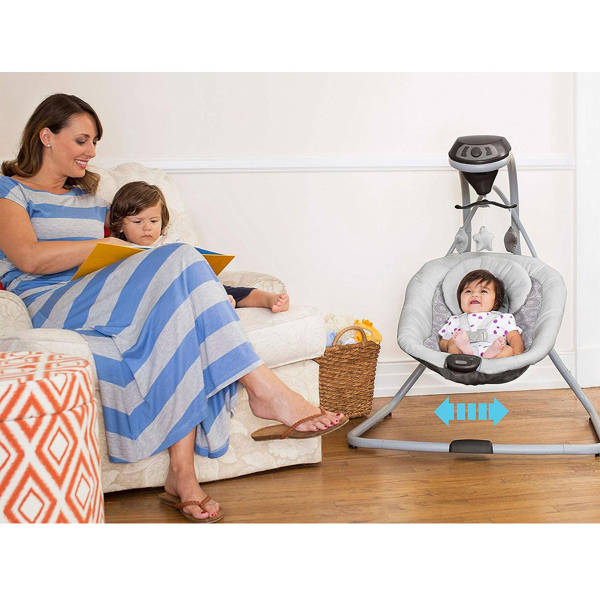 The Graco Simple Sway™ Swing offers a comforting and practical solution to soothe and entertain your baby, fitting perfectly into any space in your home with its compact design and energy efficiency.