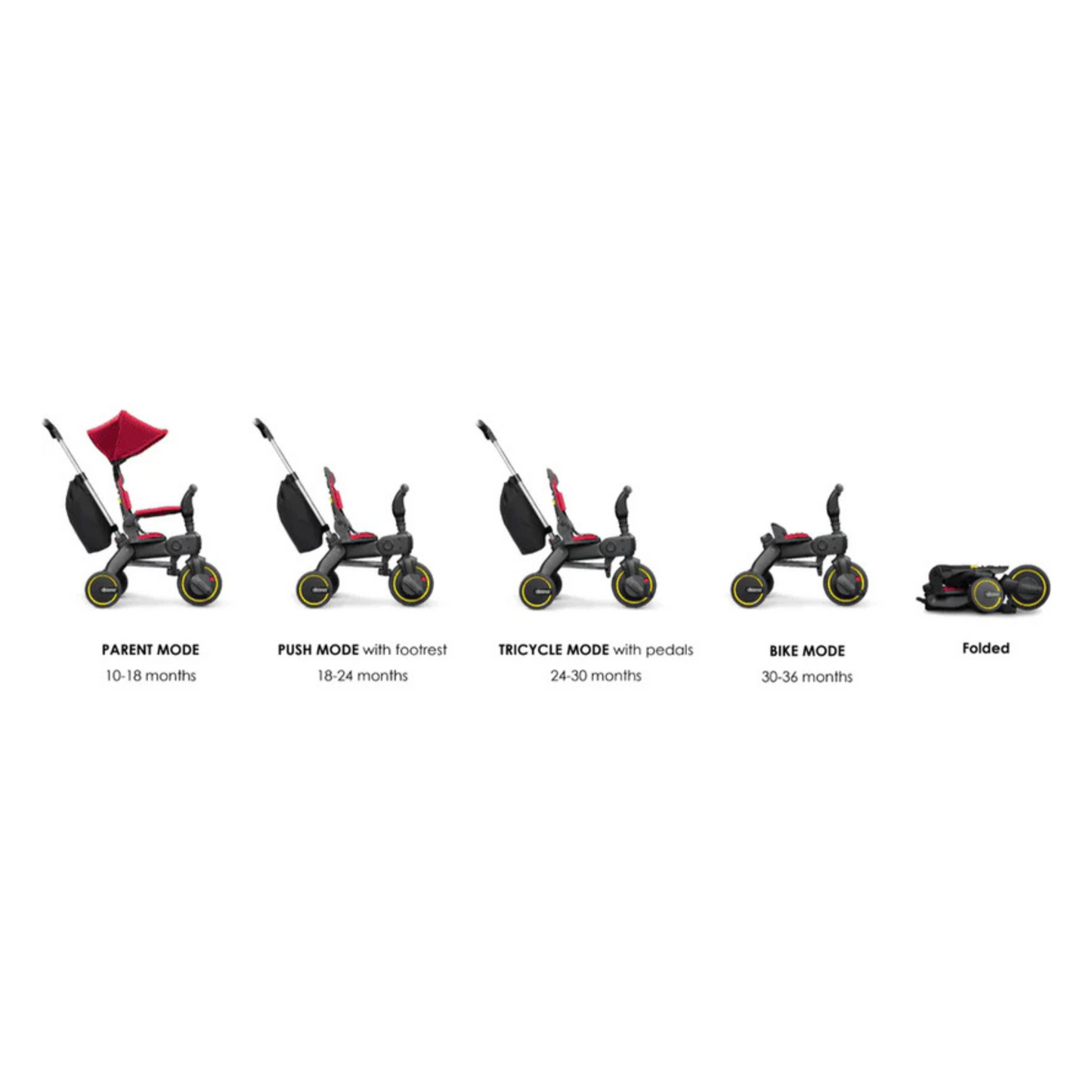 - Fase 4 (30+ meses): El niño conduce de forma independiente, con respaldo bajo y sin barra de empuje.