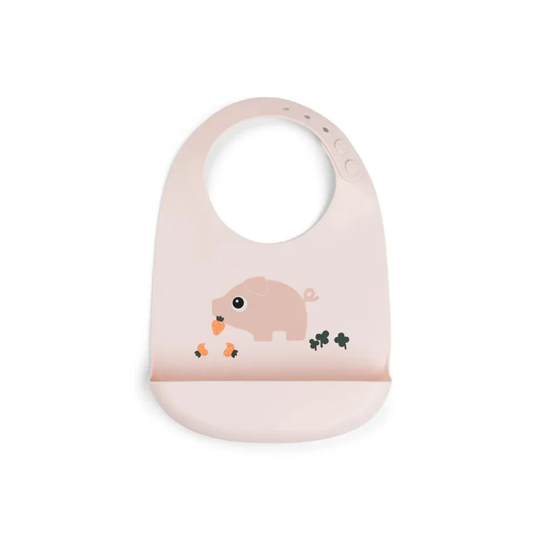 Fabricado en silicona de grado alimenticio, es completamente impermeable, suave y seguro para los más pequeños. Su correa ajustable con cierre de doble botón asegura un calce perfecto mientras tu bebé explora nuevos sabores. Además, su adorable diseño con Pigee lo convierte en un accesorio tan lindo como práctico.