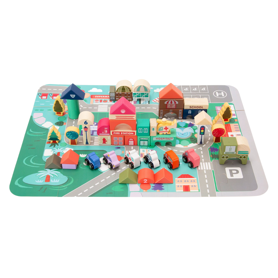 La ciudad de bloques de madera Santiago es ideal para que los niños desarrollen su creatividad e imaginación. Los juguetes de madera son biodegradables, no pasan de moda y estimulan el deseo de conocimiento en los más pequeños.