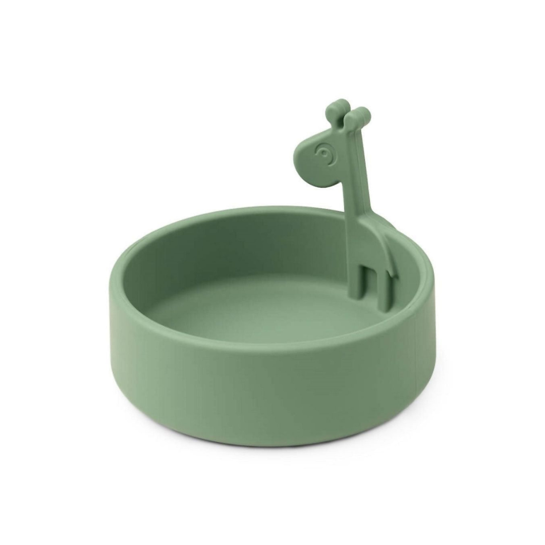 Raffi se asoma desde un lindo y práctico cuenco de silicona listo para hacer la hora de la comida el momento mas divertido del día. Con gran altura y bordes interiores redondeados, el bowl es ideal para recoger fácilmente cuando tu bebé está aprendiendo a comer solo.