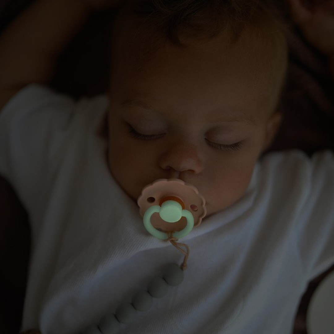 FRIGG Night está equipado con una suave función de brillo en la oscuridad que no dañará los ojos de tu bebé. El mango y la perilla brillarán en la oscuridad y resolverán el desafío de encontrar y colocar el chupete de tu bebé en medio de la noche.