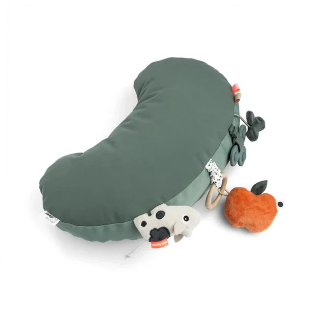 Los juguetes unidos al cojín mantienen la atención del bebé, motivándolo a moverse y descubrir a su ritmo, siempre acompañado de estímulos sensoriales que favorecen su desarrollo.