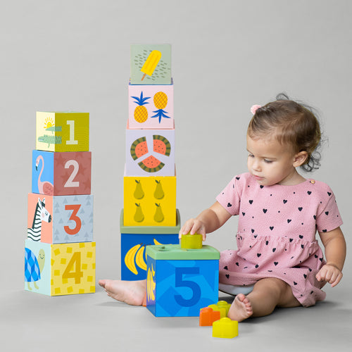 El bebé estará ocupado aprendiendo nuevos desafíos mientras desarrolla habilidades motoras finas y de resolución de problemas, mejorando la curiosidad y el sentido del descubrimiento. Los bebés pueden apilar las cinco cajas y luego empujar la torre para ver qué sucede.
