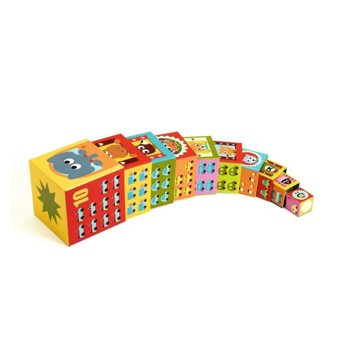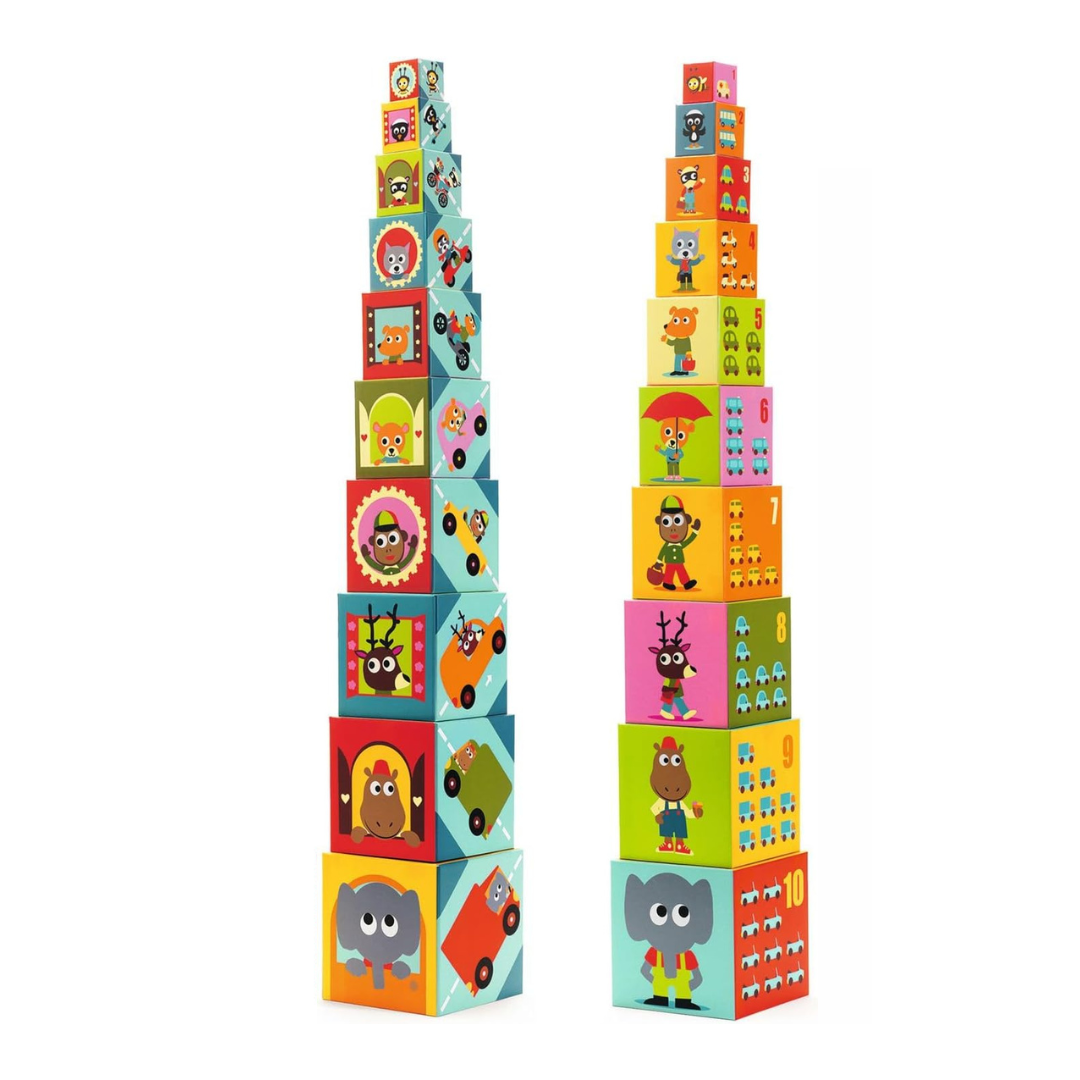 Explora un mundo de diversión y educación con nuestro juego de bloques apilables. Este set incluye 10 cubos coloridos, cada uno con encantadoras ilustraciones de autos, animales y números, perfectos para construir una torre impresionante mientras se aprende jugando.