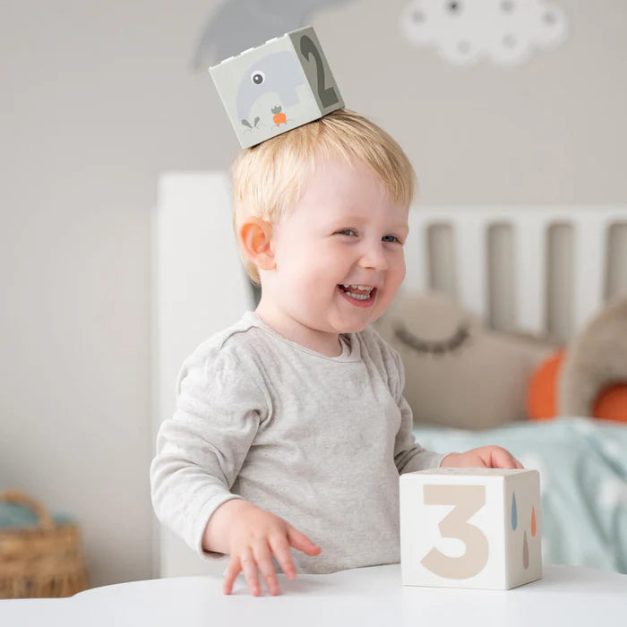 Diviértete con nuestro juego de 5 cubos apilables, decorados con una encantadora combinación de colores suaves. Estos cubos ofrecen un entretenimiento sin fin: deja que tu hijo los apile, los dé vuelta o incluso esconda pequeños tesoros en su interior.