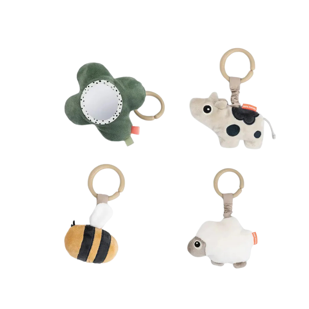 Incluye 4 juguetes colgantes ajustables y desmontables: sonajero, campana, juguete arrugable y espejo, diseñados para estimular el oído, el tacto y la curiosidad. Los juguetes pueden adaptarse a la etapa de desarrollo del bebé o usarse por separado para prolongar el entretenimiento.