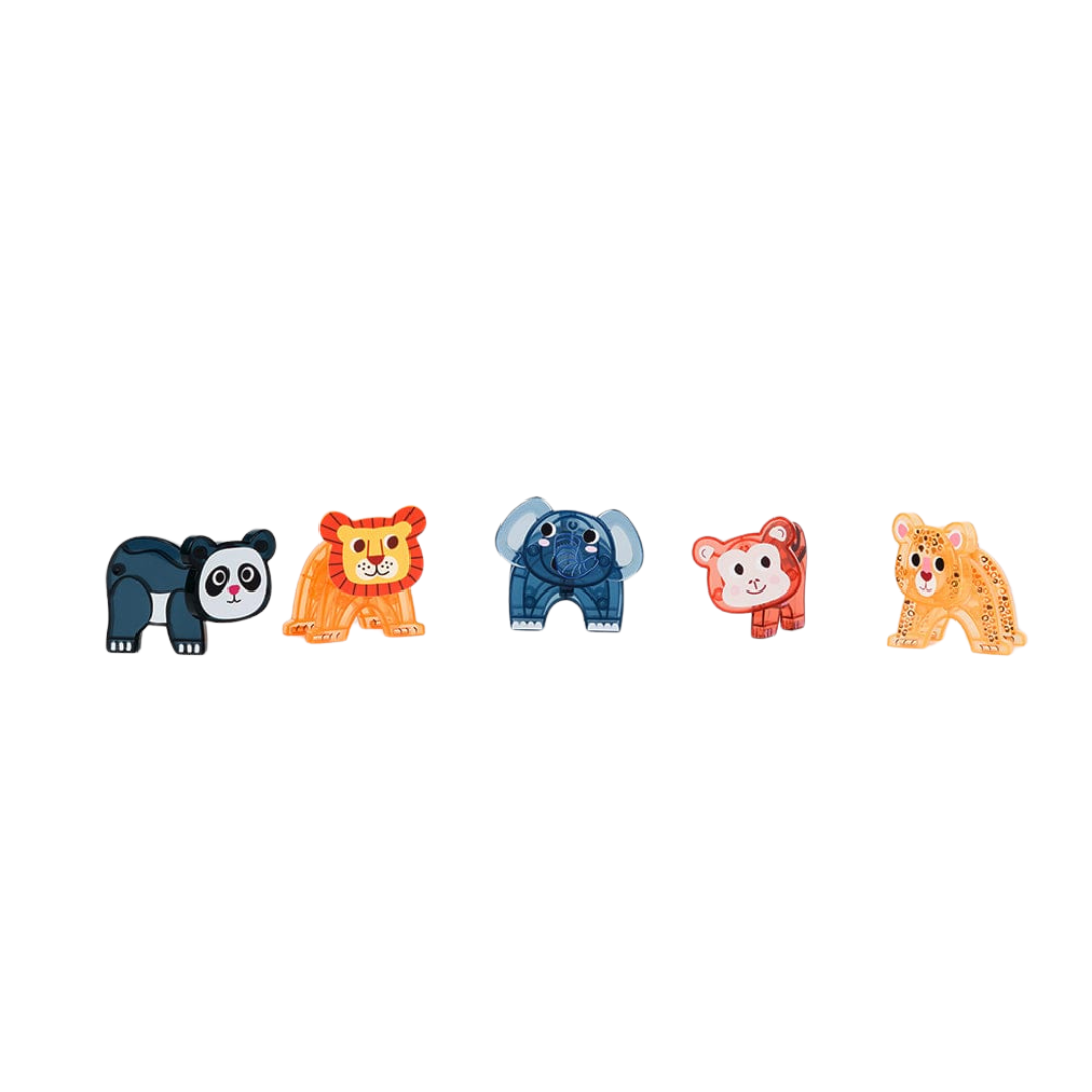 - Incluye: 1 elefante, 1 leopardo, 1 león, 1 mono y 1 oso panda.