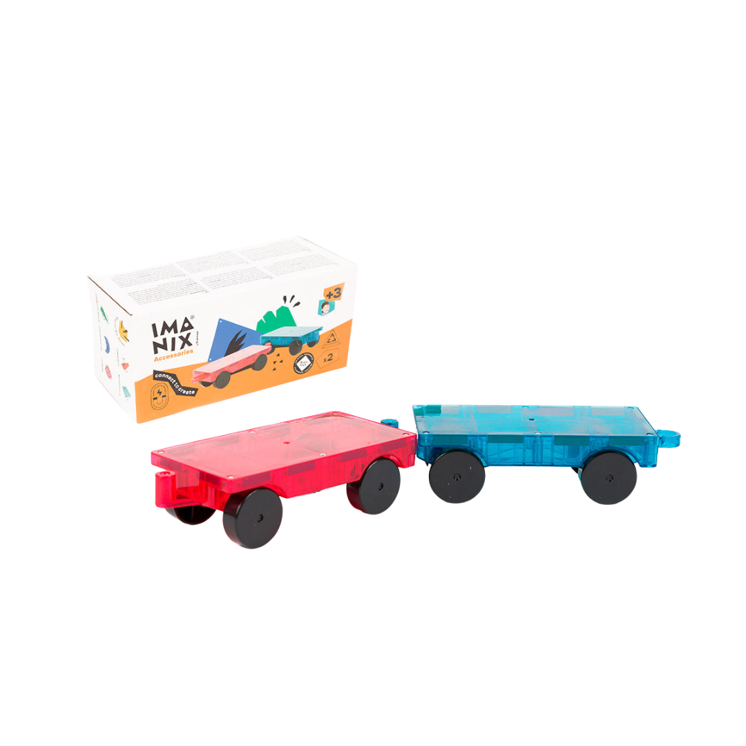 - Conexión magnética: Equipados con bases magnéticas fuertes, estos carros aseguran una unión segura y estable con otras piezas de IMANIX, facilitando la construcción de estructuras complejas.