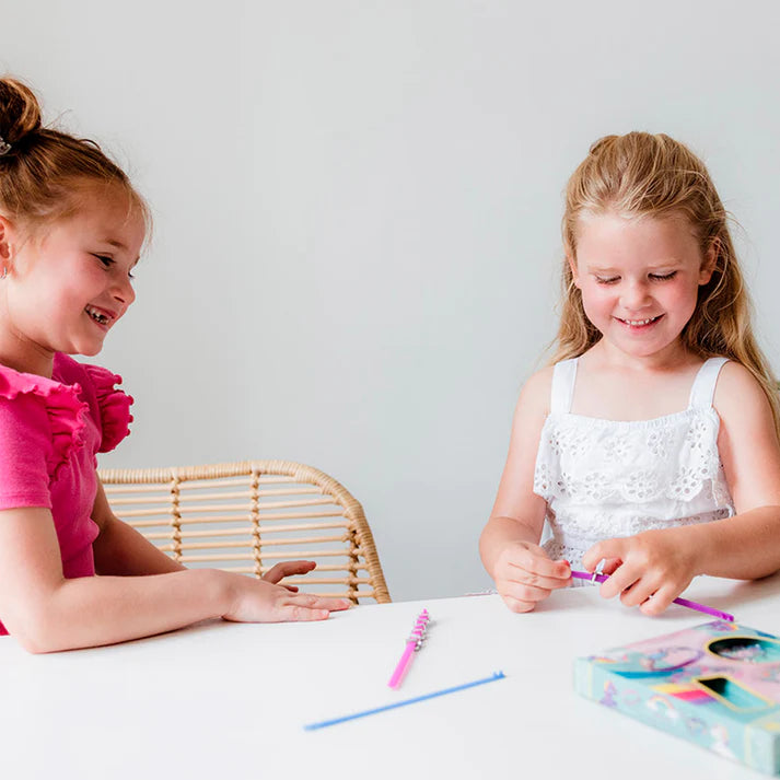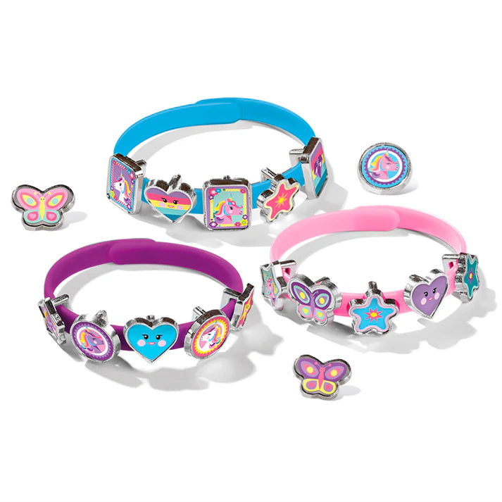 Con el set Pulseras y Charms Unicornio, las pequeñas diseñadoras podrán crear sus propias joyas mágicas una y otra vez. Incluye 18 charms plateados con ilustraciones de unicornios y fantasía, ideales para deslizar sobre las pulseras de colores incluidas y personalizarlas al gusto.
