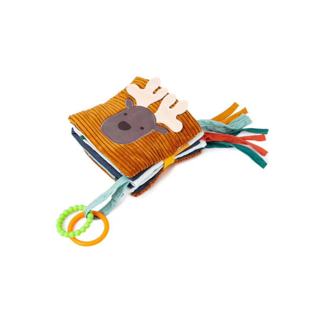 Por un lado, cuenta con una sección bicolor de alto contraste, perfecta para los primeros meses, cuando los bebés solo pueden distinguir tonos intensos como blanco y negro. Por el otro, esconde pequeñas sorpresas sensoriales que invitan a descubrir texturas, formas y sonidos a medida que el bebé crece y explora.