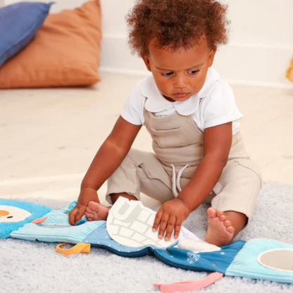 Por un lado, cuenta con una sección bicolor de alto contraste, perfecta para los primeros meses, cuando los bebés solo pueden distinguir tonos intensos como blanco y negro. Por el otro, esconde pequeñas sorpresas sensoriales que invitan a descubrir texturas, formas y sonidos a medida que el bebé crece y explora.