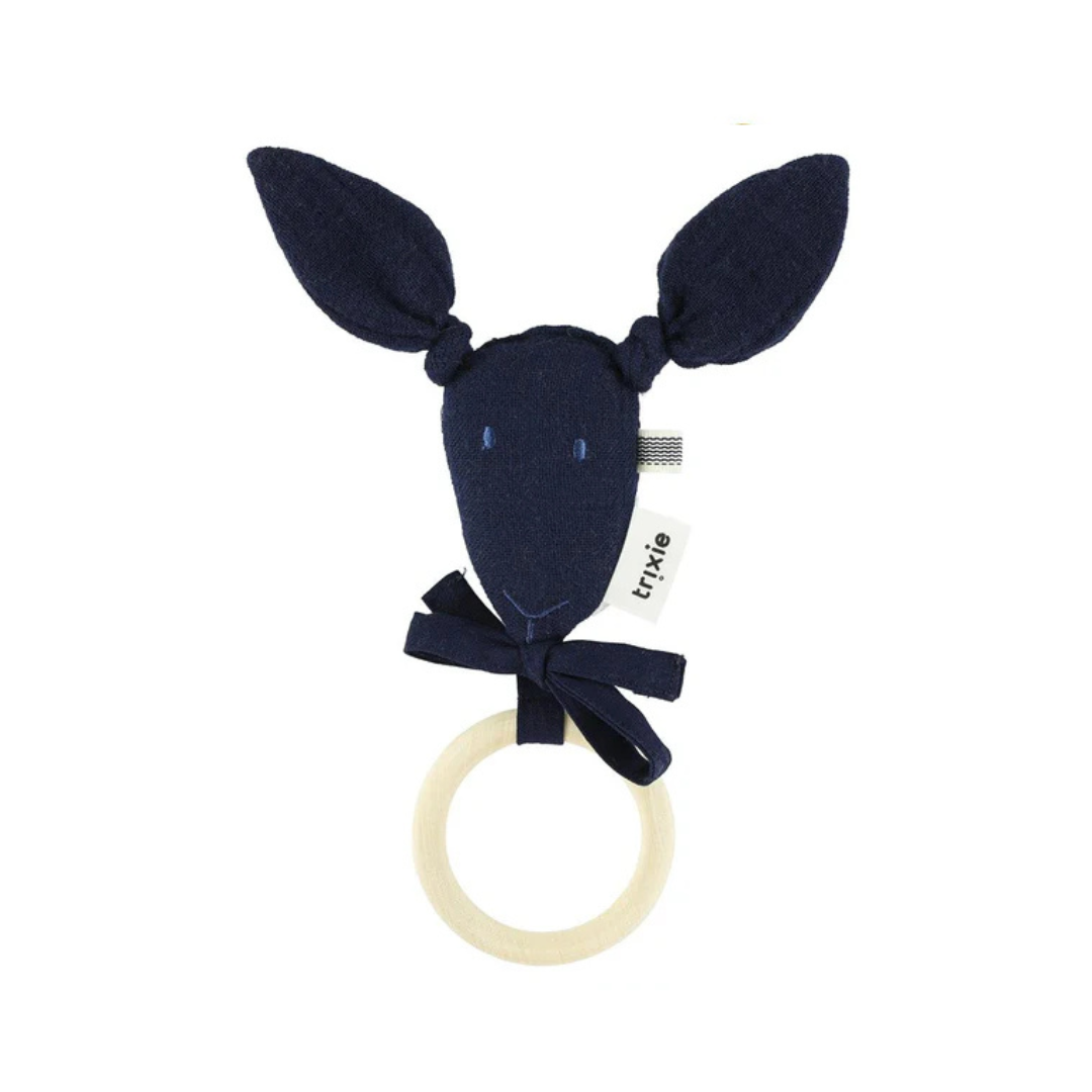 Este mordedor está hecho con un anillo de madera y un lindo canguro de algodón 100% orgánico. Tiene una pequeña campana que suena alegremente cuando tu guagua juega con el mordedor.
