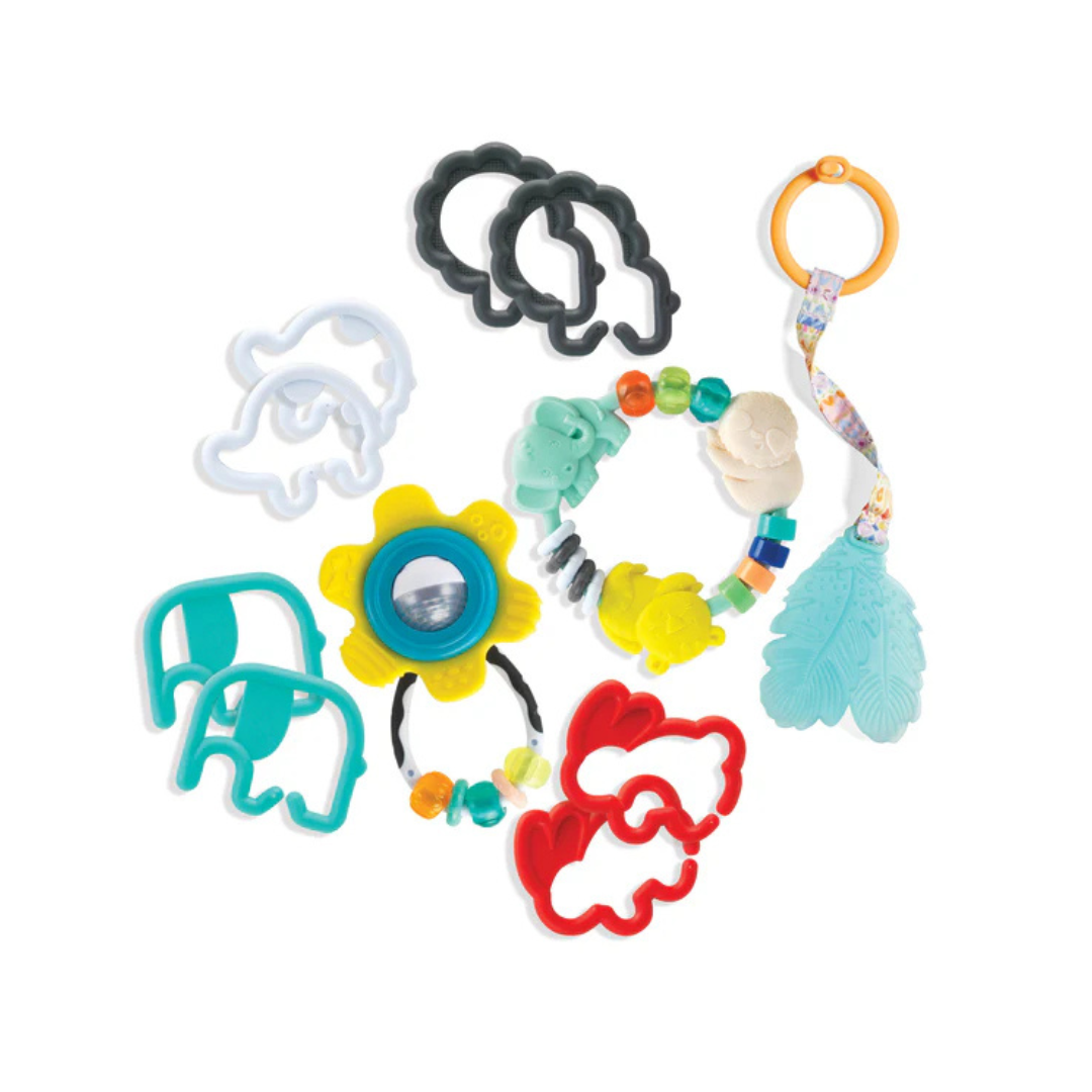 - Set de 11 piezas: Incluye sonajero mordedor giratorio, mordedor con correa, anillo de cuentas de sonajero y dentición, y enlaces de animales multifuncionales.