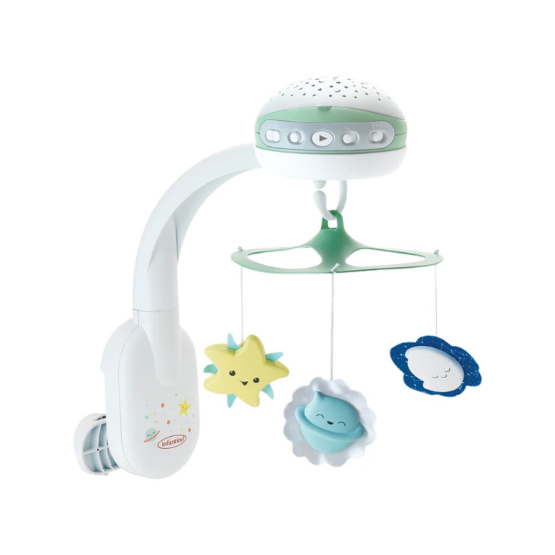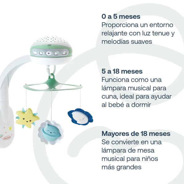 El Móvil Proyector Musical 3 en 1 de Infantino es el compañero perfecto para las noches y siestas de tu bebé, ofreciendo música, luces y proyección de estrellas que se adaptan al crecimiento de tu hijo. Con un diseño práctico y funcional, este móvil se transforma fácilmente para cumplir distintas funciones a medida que tu bebé crece.