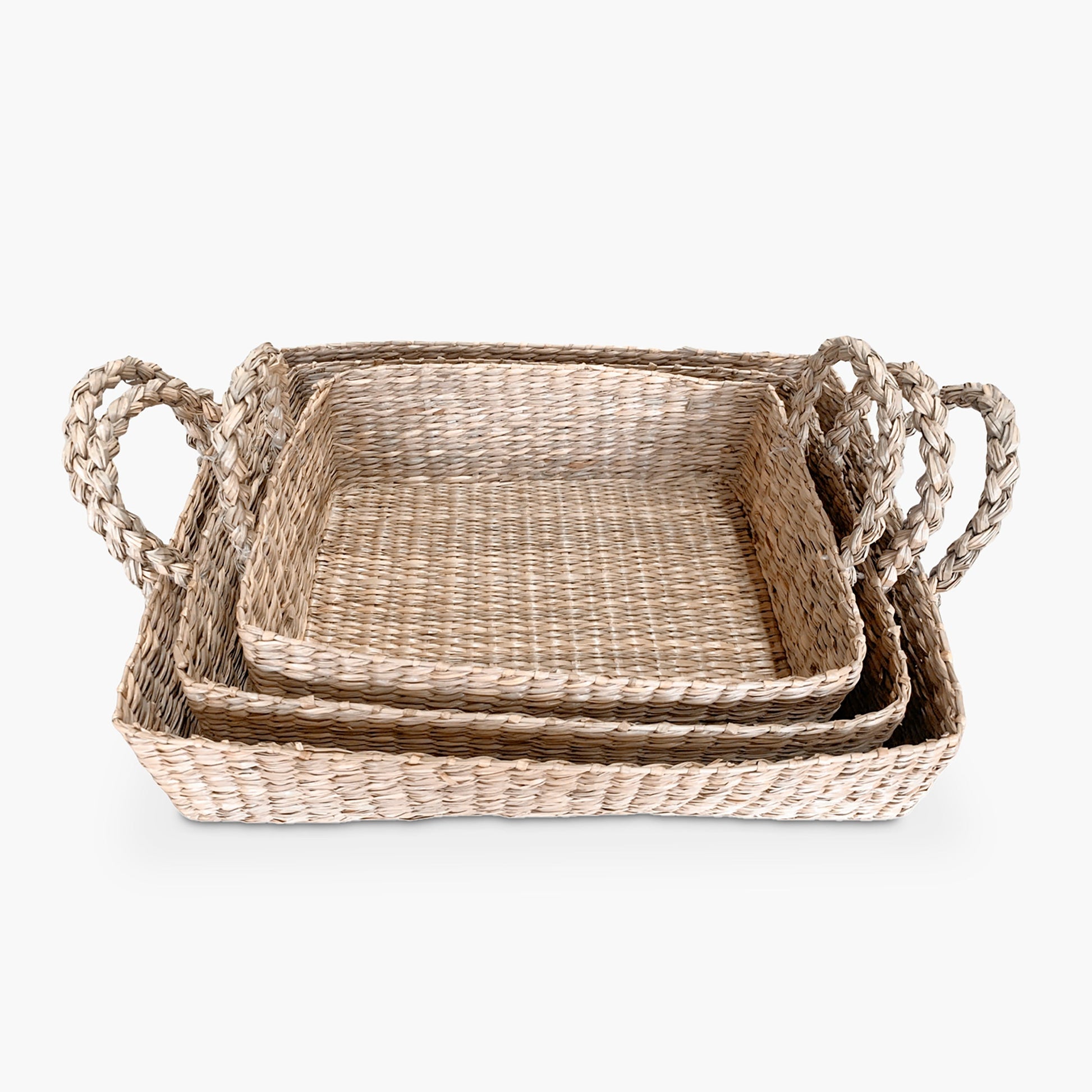 Este juego de tres canastos rectangulares, tejidos en seagrass de tono natural, es perfecto para organizar con encanto. Su diseño artesanal y tamaño versátil los convierte en aliados ideales para guardar textiles, juguetes o accesorios en cualquier espacio del hogar.