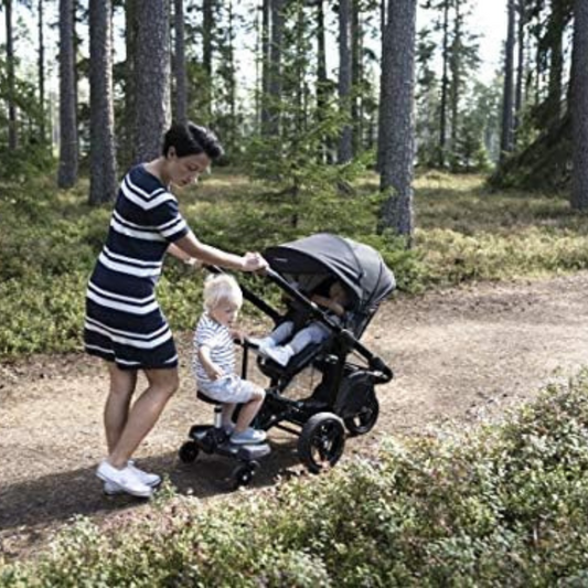 La patineta Bumprider es la solución ideal para familias con dos niños, ofreciendo un viaje cómodo para el hermano mayor mientras paseas con el coche. Su diseño universal y ajustable le permite acoplarse a casi cualquier coche de paseo, proporcionando una gran versatilidad.