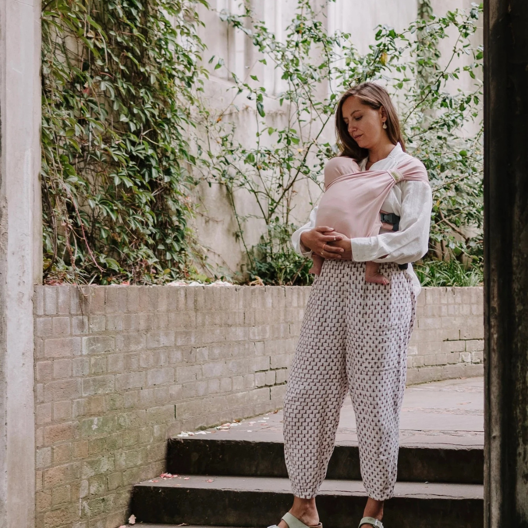 - Tela con estiramiento en cuatro direcciones que se adapta al contorno del cuerpo y del bebé.