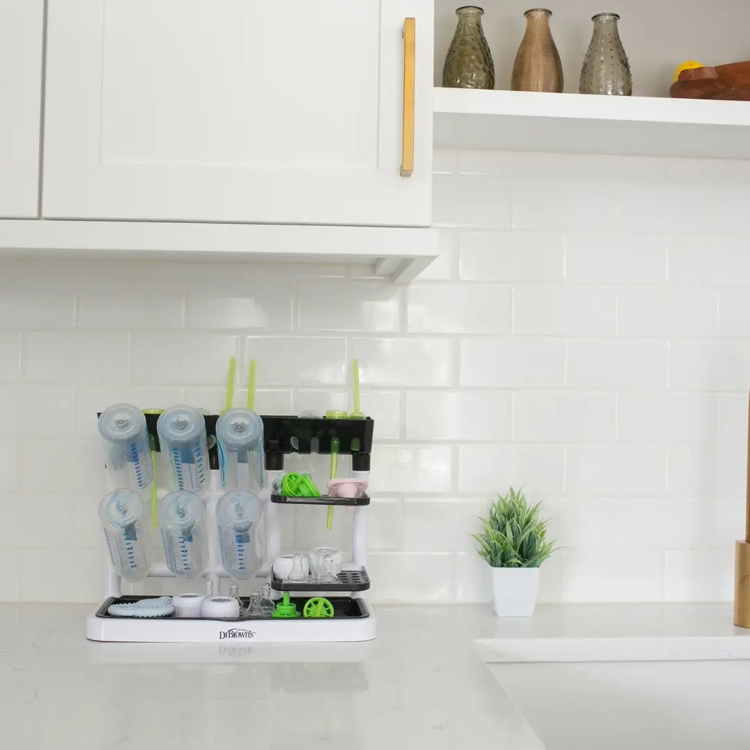- Gran capacidad: Equipado con 6 ganchos de secado, 3 bandejas amplias y un compartimento superior ideal para roscas, tetinas, tapas y pezoneras.
