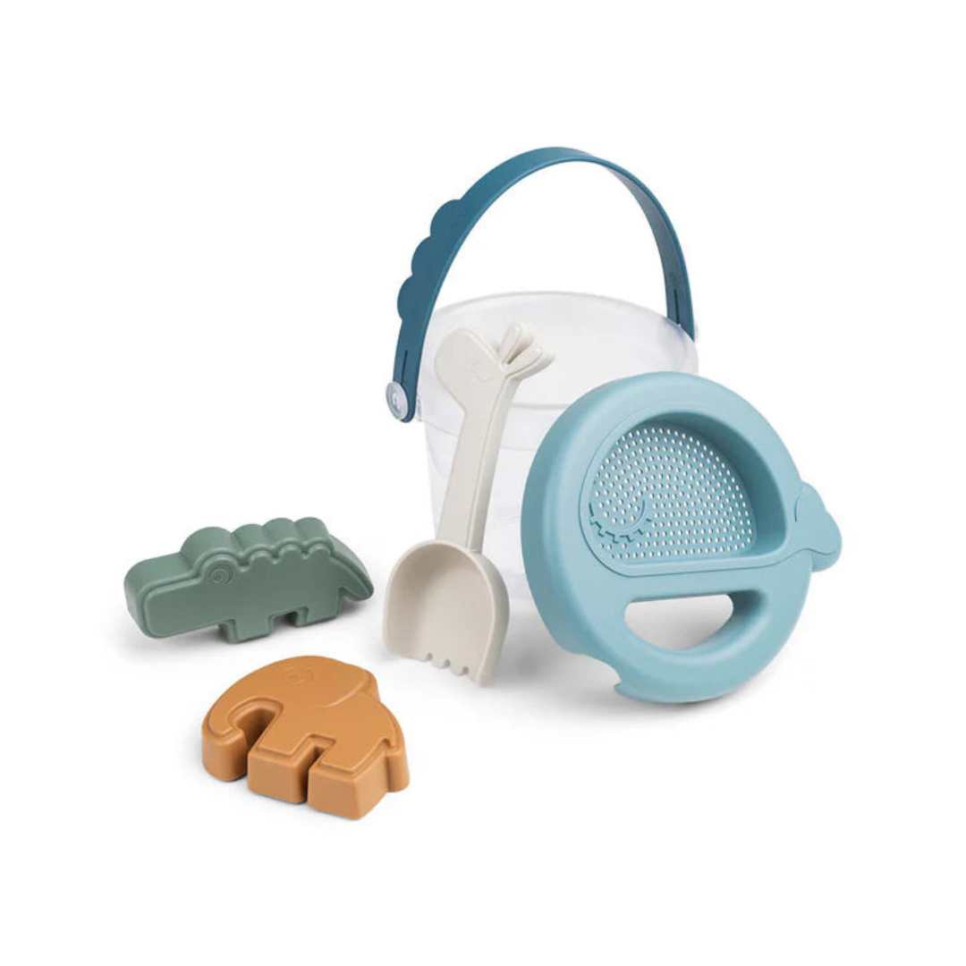 Un juego de arena perfecto para todos los niños pequeños con un molde de cocodrilo y elefante, una pala con forma de llama, un colador con forma de ballena y un cubo transparente decorado con olas y una pata.