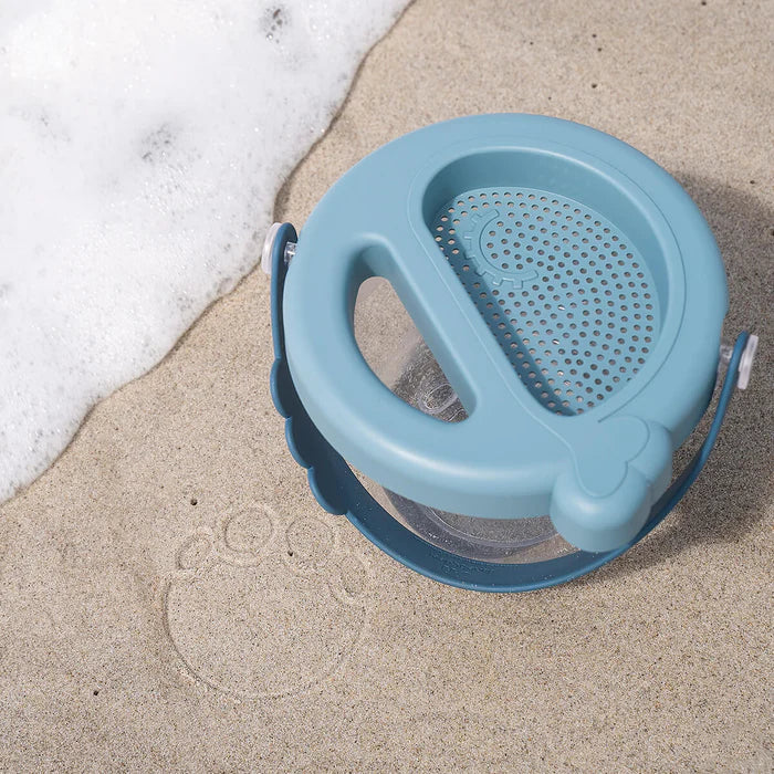 El cubo tiene una divertida tapa de Wally con un asa que también es un colador, ideal para encontrar tesoros en la arena. El juego es perfecto para hacer figuras de arena, transportar agua y estudiar cosas pequeñas en el cubo transparente.